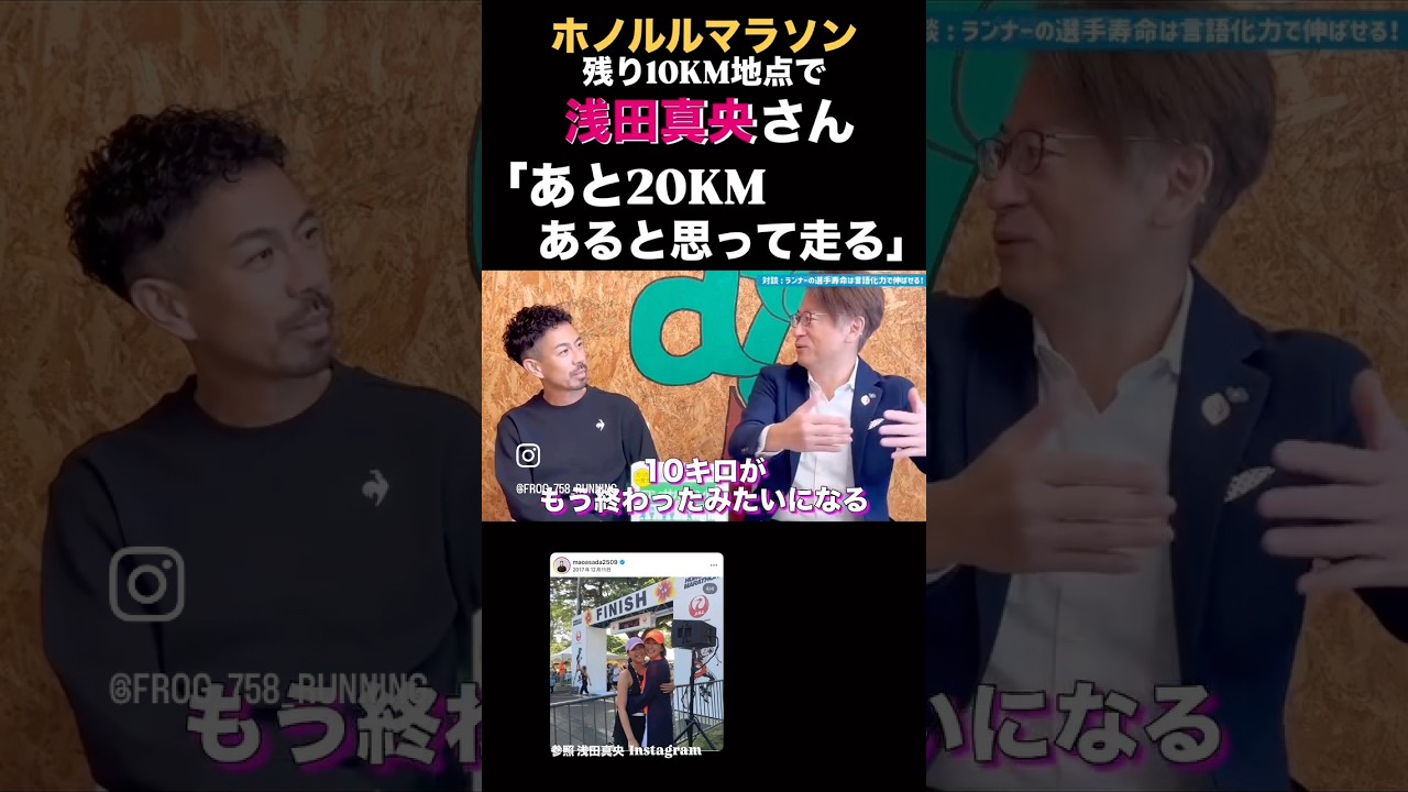 うん。 あとある時ね、あの、ちょうど僕が 5 回目ぐらいの時に、あの、ゲストランナーで浅まさんがあ、 引退した年があって、引退した翌年ね、走ってましたよね。 僕ちょうど18km 時点ぐらい走ってる時に後ろからこう TBSの車と共にまちゃん来たのですよ。 おお、まほちゃんだと横にこのぐらいの距離でこう走ってて、 で、その後一緒に、ま、一緒にってか、あの、近くで走ったんですけど で、ま、まおちゃんとそのトレーナーがなん会話してるんですよね。 はい。たまたま聞こえてきのがあと何キ g ロみたいなこと聞いてたんですが。で、トレーナーがあと 10kg ぐらいですって言って、あ、分かった。じゃあまおちゃんが言ったのがじゃああと 20km あると思って走るとか言ったんですね。 うん。 自分を騙すっていう。あと10kg なんだけど、20kgあると思って走れば 10kg が、まあ、もう終わったみたいなみたいなことを、ま、脳みそすみたいなことを、ま、喋っていて、 これをすに言葉の使い方というか、 その言葉で自分を逃してい騙して持ちこえようとするみたいなことがあったりとか。 うん。ああ。 ま、いいずれにせ、この うん。 いくつかの段階をちゃんと決めとくと はい。途中でここはポキッとれずに すむなって思っ