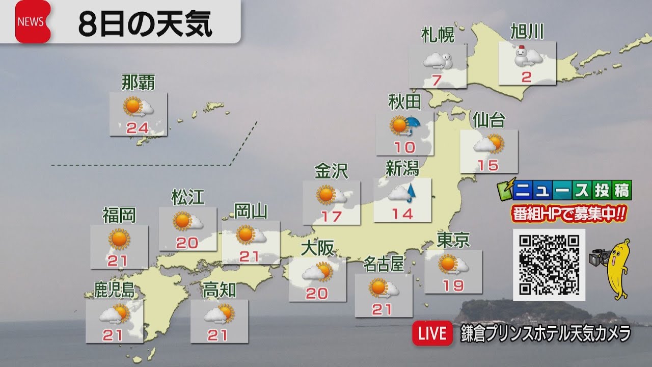 気温は関東から西は20度前後で暖かいですが、北日本では寒の戻りとなるでしょう。
