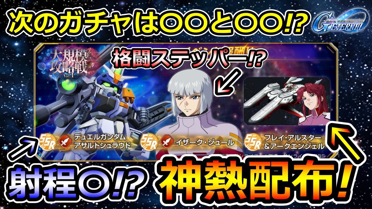 お疲れ様です。ゼ中です。え、今回の動画 は、え、ついに来ました。激アの更新情報 。大規模戦、大規模攻略戦ボリム1開催 予告ということで、え、ま、昨日かなと 思ったんですが、今月は1日おれの、え、 12月5日とで先に言うんですが、え、 開催される日が12月8日、12時よりと いうことで、え、僕は1212日を予想し てたんですけど、だいぶ早かったっすね。 え、8月8日のSDガンダムのストリー イベントと同じ8日になりました。え、ま 、これはね、予想外したら、え、 ペナルティというかあれで、え、ま、あれ ですね、ガチャキャラのあの予想が当たっ た人にプレゼントするって言ってたんです けど、え、1名じゃなくてそれを2名に しようかなと思います。ま、外れはしまし たけどでだいぶ早くなったんでだって、え 、ま、金曜日を予想してたらその週の頭の 月曜日ということなんでだいぶ早く遊べる ということでもう全然構わないです。予想 が外れても16日に、え、なってたら、え 、遅くなるく、え、そのね、多く払わ なければいけないんで、マジ最悪だったん ですけど、8日ということでめちゃくちゃ ありがたいですね。で、またあんまり早 すぎるとその後がね、虚になるっていう あれもあるんですが、どうせ今月は12月 下旬の方に生放送がもうこれはね、もう8 割、9割、いや、もう10割ぐらいあると 思ってるんで、え、今月はね、早めに来て もどうせ後半は結構楽しみがいっぱいある んで、早い更新に越したことはないなと 思いました。まあ、でも月か金のどれかに 来るって言ってたんで、そんなに大きくは 外してないでしょ。8か9か12とは言っ てたんで、そこは許してください。で、 これまでマップイベントとして、え、開催 していたイベントの内容をアップデートし 、イベントの名称を新たに大規模攻略戦と して開催いたしますと。で、その主な アップデート内容なんですけど、新規要素 として仲間のキャラクター、ユニットが本 のバトルに一緒に参加するようになります 。え、仲間はイベントの攻略を進めること でレアリティやレベル、武装レベル、限界 突破段階を強化することができます。仲間 はイベント終了後にイベント内で強化した 内容が反映された状態で獲得することが できますと。で、大規模攻略戦とは、え、 本イベントは仲間と共に様々な区域を投破 していき、最部にいる強敵の撃破を目指す イベントです。このイベントではPPと いうイベント専用の行動ポイントを使用し ます。ま、この辺は今までのマップ イベントとそんなあれですね。で、その 主な報酬が、え、SSR攻撃型のデュエル ガンダム、アサルトシュラウドとで、あと 、え、SSRのイザークとSSRの フレイトめちゃめちゃいらしい顔してます ね。で、今回のイベントではSSR キャラクタージュールとSSRユニット、 デュエルガンダム、アサルト、シュラウド 、SSRサポーター、フレイアルスター& アークエンジェルを手に入れることができ ます。なお、イベントを進めていくことで サポーターとユニットを最大まで減価する 、限界突破することができるのも本 イベントの特徴ですと。で、キャラクター とユニットのレアリティは強化が行われて ない場合、SRでの獲得となりますと書い てあるんで、え、さっき言ってた仲間って いうのは多分このイザクっていうことなの かな。あんな仲間を獲得して強化でき るっていう言い方だとなんか2体3体 もらえるのかなってちょっと思ったんです けど、どうやらイザークだけっぽいすよね 。他になんか何体かキャラもらえたら多分 ここで紹介してると思うんで、なんか仲間 って言われるとね、複数想像しちゃうんす けど、ま、一応あのイザークとこのフレイ もその仲間っていうのに含まれてんのかな 。でも多分フレイは別にそんな強化とかは ないすよね。ま、その限界突ッパーはある にせよ。で、このユニットのレアリティと あとキャラクターは最初はSRで獲得して 、ま、だんだん強化してSSRにしてって いう感じなのかな。で、アビリティもつけ てってっていう。だ、今までプルとか カトルはその出来上がった、完成した状態 をもらってたんだけど、今度からはそれを こう強化する、育成する段階を楽しんで くださいねっていうことなのかな。ま、 それだとそんなにどうなんだっていう感じ はしますけど、ま、お菓子作り体験が できるようになったみたいな感じなのかな 。今までは完成したお菓子をこうもらう だけだったみたいな。で、性能が一部 分かってるんで見ていきましょう。SSR イザアクジュールシリーズが、え、 ガンダムシードタイプが攻撃型で、え、 アビリティが与ダメージ上昇レベル3と。 これがおそらく、え、ダメージ15% アップ。攻撃力15%アップだっけ?あれ ですね。で、コーディネーターレベル3が 、え、このロンドギナに似てるかな? コーディネーターレベル3自身の覚醒値と 反応値が15%上昇というスキルになって ます。ま、これは元の数値次第なんで ぶ