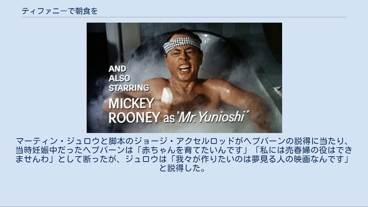 詳細は「ティファニーで朝食を (映画)」を参照 監督はブレイク・エドワーズ、主演はオードリー・ヘプバーン、共演はジョージ・ペパード。