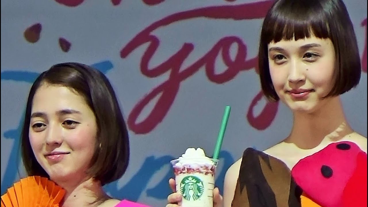2015年4月14日 東京・六本木 モデルの水原希子さんの妹で同じくモデルの水原佑果(ゆか)さん、女優の満島ひかりさんの妹でモデルの満島みなみさんがスターバックス コーヒーの新作「フルーツ オン トップ ヨーグルト フラペチーノ with クラッシュ ナッツ」の商品発表会に登場しました。