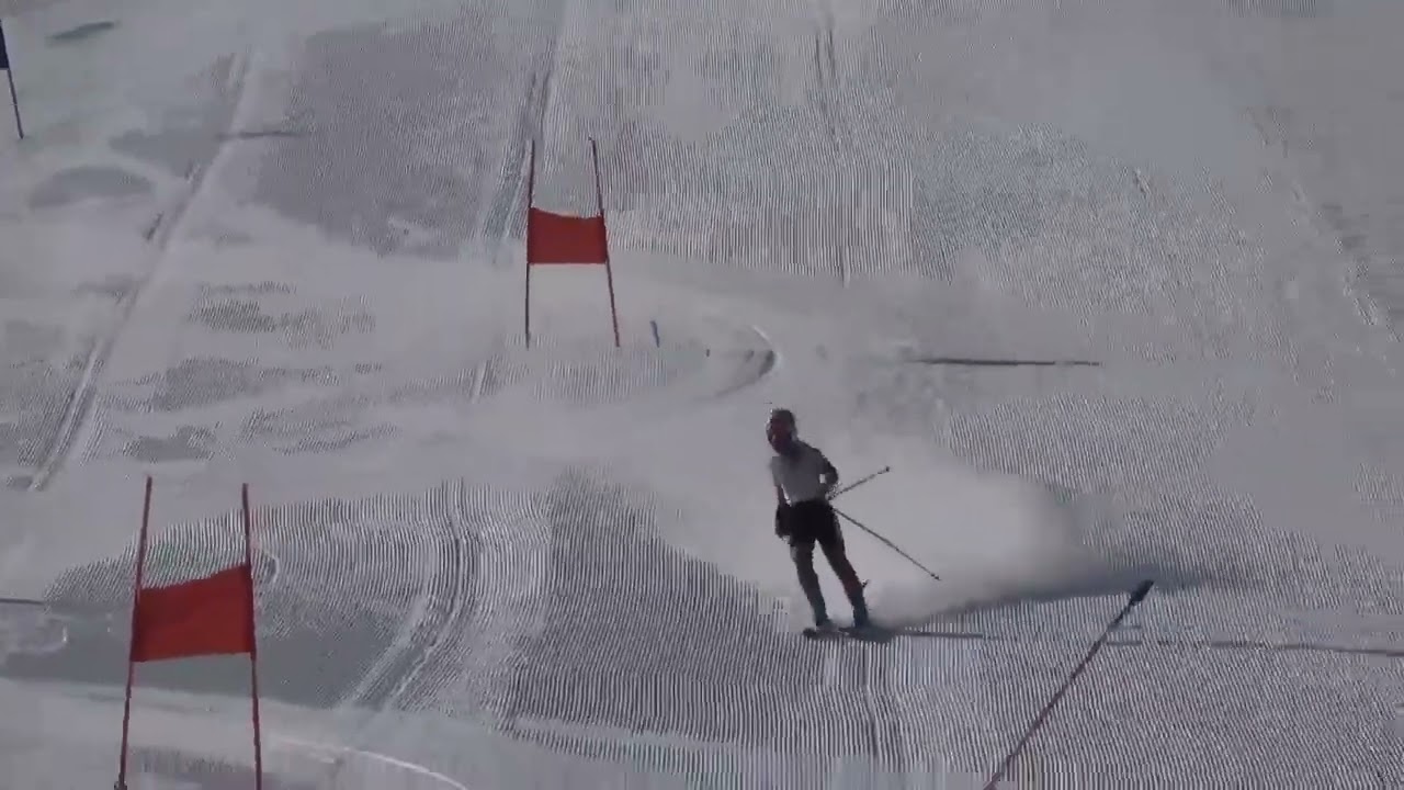 あとは4本目かな。 しっかり曲げてから。そう、曲げて。 しっかり引きつけて。引きつけて。曲げ ないと。ほら、スキー曲げれてないから ラインがどんどんどんどん装されてくる。 しっかり1回前に重心持っていきながらよ 。