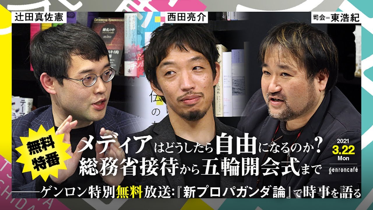 いったいこの国はどうなってしまうのか。このたびゲンロンでは、『新プロパガンダ論』を上梓したばかりの近現代史研究家・辻田真佐憲氏、社会学者・西田亮介氏コンビを迎え、東浩紀が司会・聞き手となって無料特番を放送する。