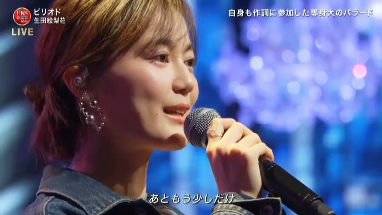 嘘はつき慣れ てないね。優しすぎてずいよ。ずるいよ。 私がピリ を打つよ。 [音楽] [拍手] [音楽] 私なんてさ、ゆ割りには自分が 大事みたいで昨日の傷を変わる 壊れないよ。触れずに待ち続けた。いつ か目 に浮かぶあなたの本音。あともう少しだけ 。あともう少しだけ。我がまを声にしてた なら違ったのかな?嘘はつき慣れてないね 。優しすぎてずるいよ。ずるいよ。 月が胸を刺すた。歪ませ たくないなんて綺麗いなままるね。辛いね 。私がピリオを打つよ。 そはもつかないで心のまま2人の未来に 続きがなかっただけ別々 の道を今歩み出すよ。あなたを愛した私に ピリオドを打つよ。 さよなら。さよなら。2人にピを打つ表 [音楽] さん、ありがとうございました。
