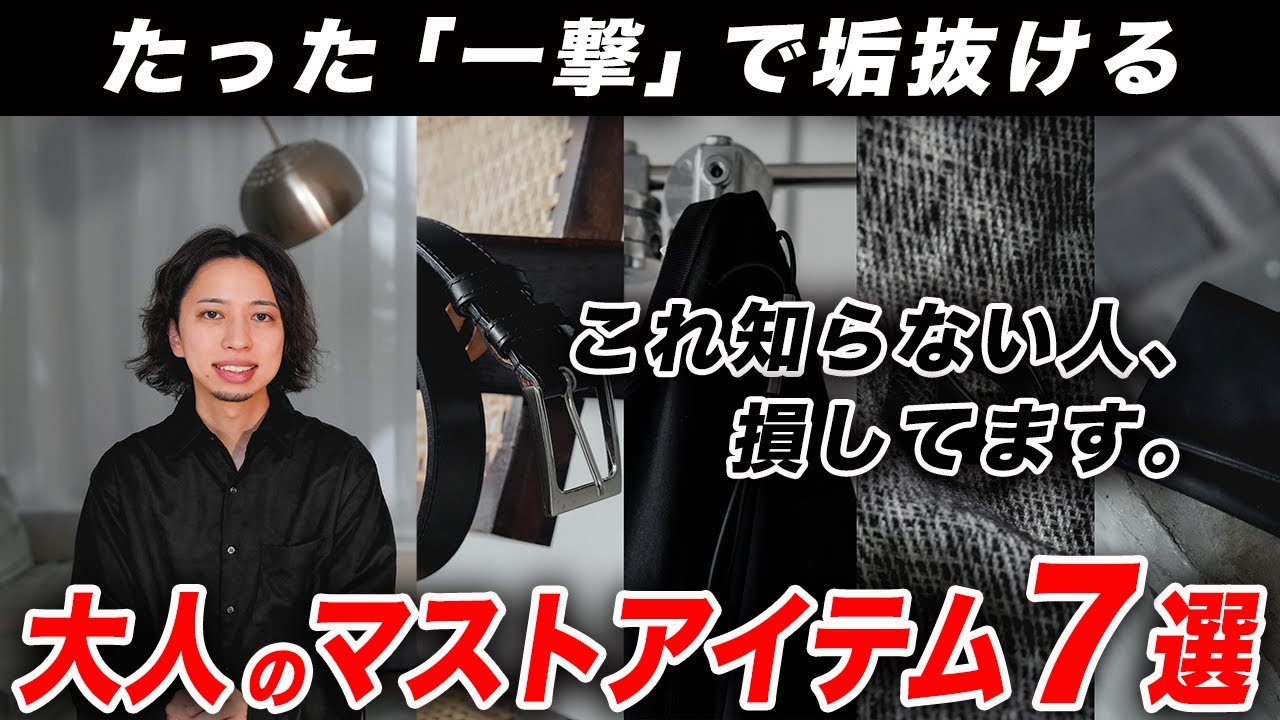 [音楽] はい、こんにちは。またです。 ファッションションってコーディネートも もちろんね、超重要なんですけど、その前 にそもそも何を買うのかっていうのが超 重要なんですよ。どんなに着こなしをね、 工夫したり頑張って思考錯誤したとしても そもそも購入するアイテムの方向性間違っ ていると一生懸命おしゃれしようとしても なかなかうまくいかないわけです。実際 おしゃれな人ほどもはや無意識レベルで、 ま、次何買おうかなとか、こんなアイテム 探そうだったり、どんな目的で買うかを 整理して買っているわけです。今回の動画 ではそんな考え方をもに大人はこの アイテム買った方がいいですよ。これ早く 買えば買うほどファッション的には有利に なりますよ。みんなここを買わないから。 これを避けてるからなかなか ステップアップできないんですよ。といっ た感じでいろんなアイテムを紹介して いこうと思います。なぜこのアイテムが 必要なのかという理由にね、焦点を当てて 解説していくので、次の衣服何買おうか なっていう悩みを持ってる方だったり、 色々買ってるのに結局あんまりレベル 上がってないななんていう人是非ね、今回 の動画を買い物の指針参考にしてみて ください。この動画を見終わる頃には きっとですね、自分のワードローブ見直し たくなっているはずです。この動画でお 伝えしたいのはおしゃれションっていうの はアイテム選びから始まるっていうところ 。多くの人が洋服小物なんとなくで買って しまう。これがよくある買い物の失敗の 原因です。ちなみに僕が運営してる ブランドシティもですね、多くのアイテム は課題解決から始まっています。例えば イベントとかをやって来てくれるね、 フォロワーさんのファッションとかを見て 、今ここがね、全体的に足りてないなだっ たり、こういった悩みがあるんだってのは 分かって、それをね、物づりに反映してい くっていうこともしているわけなんです けど、ま、例えばコーディネート的に 大人っぽさが足りないなとか、華やかさが 足りないなとか、無難すぎて差別化ができ てないなとか、ま、いろんなパターンが あるわけなんですけど、そういったところ を1つ1つ解決していくために物づりをし ています。なので今回はそれぞれの アイテムがどんな課題を解決してなぜ買っ た方がいいのかこの辺りもね解説して いこうかなと思います。 [音楽] ということで必要なのには理由がある おしゃれな大人が買うべきアイテム 7000見ていきたいと思います。まず1 つ目ジュエリー。ジュエリーがあると大人 のコデがいまい赤抜けないというね課題を 解決してくれます。年齢重ねれば重ねる ほど無難なファッションまではいけるけど なんか赤抜けないんだよなという人がね 結構多いんですよ。で、この悩みもね、 よくね、相談されるんですけど、華やかさ が足りてない人が非常に多くて、そもそも おしゃれな本質っていうのは差別化なん ですね。周りとの違いっていうのがもう 必要不可欠絶対に必要なんです。とにかく 無難にしたいっていうね、ところが目標の 人は別に差別化する必要がなくて、 おしゃれだと思われたいってことじゃない と思うんで、それでいいんですけど、周り よりちょっと優れた状態、え、おしゃれに 見られたいっていうところが目標なので あれば人との違いっていうのが めちゃめちゃ重要になってくるし、それが ないとおしゃれだとは思われません。なぜ なのかって言ったら、ま、よくこの例え話 するんですけど、10人、ま、誰か人がい て全員全く同じ格好していたらもう本当 普通なんですよ。全員無難だねと。誰も ダサいもないし、誰もおしゃれもない状態 。ま、それはそうですよね。みんな同じ 格好してるんだから。で、周りと違いが あるからその人がおしゃれに見えるわけ です。ま、これがいわゆる差別化なんです よ。とはいえはちゃめちゃな格好をして たら、え、もちろん周りと違けるただの変 な人になるので、客観性を保った上で差別 化するっていう必要はあります。じゃ、 どうすれば客観性を保った上で差別化 できるのかって言うと、ま、超簡単なのが 小物を増やすことなんですね。小物って何 なのかって言うと、ま、こういった ジュエリーを筆頭に帽子だったり、え、 マフラーだったり、眼ガネだったり、ま、 こういった感じなんですけど、こういった 小物を増やすと勝手に差別化されていき ます。なぜならメツファッション頑張っ てる人ってそもそも日本人男性ほとんどい ません。なので小物まで記憶配ってる人 ってのはまずいないわけです。で、洋服 だけではなしない赤抜けをしてくれるのが 小物の力でその中でもシルバーの輝きとか があるんでジュエリが1番赤抜けやすい わけです。おまけに年齢重ねれば重ねる ほどカレーで華やかさってどんどん減って いく、失われていくんです。そこを保管し てくれるのがジュエリーアクセリーだっ たりする