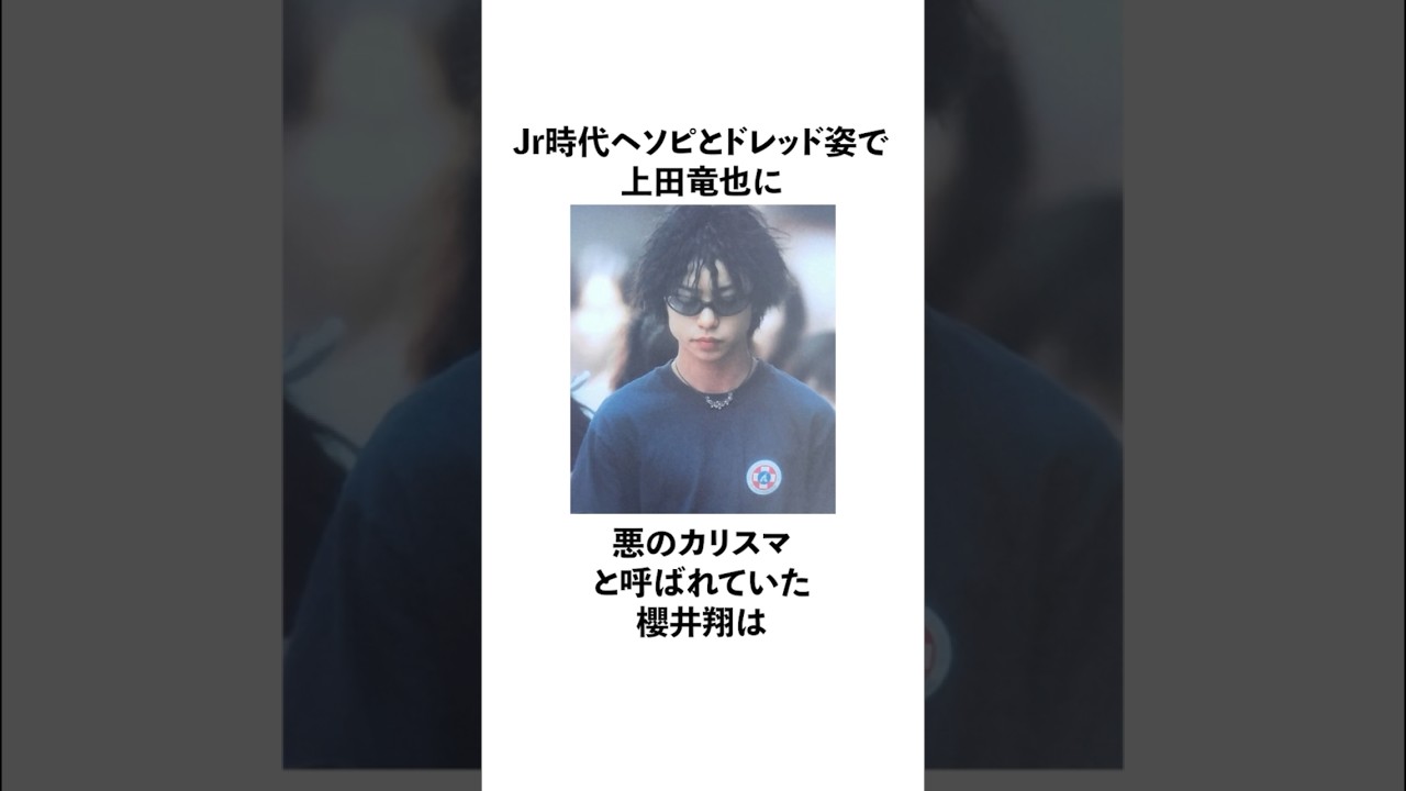 ジュニア時代へそとドレッド姿で上田に悪 のカリスマと呼ばれていた桜将はジュニア 時代にジャージブームがありシャカシャカ 派とジャージ派で別れていたが誰も持って いないベロアのジャージで登場していた 桜井翔は高校時代に右手にシャーペン左手 に消しのむ手にヤングジャンプという全く 勉強する気がない姿で投稿していた桜井翔 は18歳の時渋谷センター街が流行で何を するでもなく渋谷のゲセンにたたり通って いた桜井翔の学生時代のお弁当のメニュー は納豆ご飯や即石トルトカレーなど基礎 店外なものだった桜井しは5歳の頃母親と 渋谷の街中で大喧嘩をして怒った母はバス で帰ってしまい母が乗ったバスを睨み ながら40分近くかけて時で帰っていた 桜井しは打ち上げのカラオケでタンク トップになりライターを思って盛り上げる が急にトイレに行くと言い残し戻ってこ なかった桜井しはここが俺のできるピーク だと思って盛り上がらない場を見るのが 怖くて帰ったと説明したそんな桜賞の父親 は食事中に立ち上がるたりに照明に頭を ぶつけるようなおっちょこちょいで面白い 人と判明している