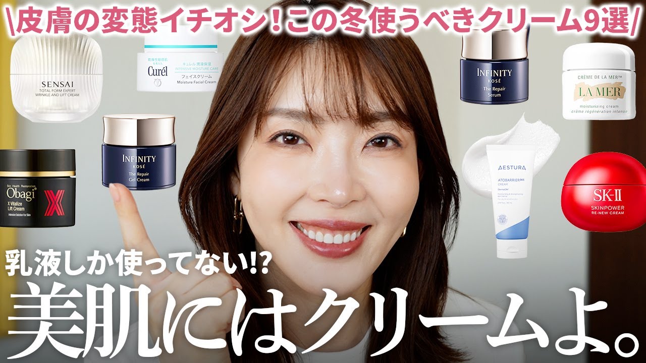 こんにちは。大野まり子です。今日は綺麗 になりたいならこれ使っとけ。クリーム 徹底解説。時々すごいびっくりしちゃうの が若者とスキンケアの話をしてるとね、 美容液で終わりとかシートマスクして ファンデーション塗とかがいて不わって 思う時があるんです。あとは乳液は塗る けどクリームは塗らないという方がいて この時期是非クリームを使っていただき たいという啓問活動の一環としてこの動画 を撮ることにしました。なぜならば感想が 全てのエイジングの始まりで乾燥するから 表面がしわしわっとしてきてそれが刻まれ て本当の芝になってくし乾燥するから たるみとかも気になってくるし乾燥する からで敏感になってしまって赤身になって くるしっていう冬の時期は特に全ての 肌悩みの根源となってしまうものなので、 ま、乳液ももちろんいいんですけれども より油分の多いクリームでしっかり蓋をし て潤いを閉じ込めてあげるっていうことが 大です。最近はテクスチャーも色々なもの が出てきて、かなり水みしいものとかも あるので、是非使ったことないよっていう 方は使ってみてください。様々なクリーム の中からこんなお肌を目指す方にはこの クリームがおすめっていうご紹介をして みるので、是非ご参考にしてくださったら 嬉しいです。それでは行ってみよう。 クリーム使い始めるタイミングって難しい と思うんですけど、春夏から秋冬にスキン ケアシフトする時の見やすにしてるのが やっぱり夕方とかスキンケアから時間が 経った時の肌。夕方なんかこの辺が ピキピキって乾燥してきたなていう時はあ 、クリームにチェンジするタイミングだな と思うし、あとは夜スキンケアして朝起き た時にあれスキンケアどこ行っちゃった ぐらいなんかちょっとパサっとしてる時は あ、もうそろそろこのジェル上のものから クリームに変えなきゃなっていう風に思っ たりするタイミングなのでどのぐらいの 保湿力があるクリームを使ったらいいのか なっていうのは自分がスキンケアしてから ちょっと時間が経った時の肌をちょっと チェックしてみていや私すごい油出てる からまだジェルでいいやとかジェル クリームでいいやとかいうことの目安に できたらなっていう風に思います。 私は18ぐらいから使ってます。なぜなら スキンケアバカだから。それは潤思いが 必要だと思ってクリームを買い始めまし たっていうよりかはデュラメールが使い たいからとか美容紙に乗ってたクリームを 顔に乗せたいからっていう理由で使い始め てます。でも意外と水みしいものも当時 からあった気がします。 でもクリームといえばやっぱこのモイスチャライジングクリームを使ってました。勝手に ファーストクリームってことですか? いやいや、その前からクリーム使ってたけど印象に残ってるのは母のこのクリームをこういっちりつつ取ってんだけど尻り荷物れば山となるって私はこのクリームで覚えたぐらい毎日使ってるとやっぱすごい減るんですよね。 母になんでこんなに減ってんのって8回 ぐらい言われたことありますけど全然白い 顔してましたけどね。で白なみたいな感じ の顔しながらずっと使ってた。これが本当 の隠れ愛用品っていう感じで使ってみまし た。で、今期たくさん新製品も出てる中で こういう風な肌作りをしたい方にこれがお すめって分けてみたんですが、私の中で フェイスラインに今まではなんか成分で みたいな紹介してたんだけど、結構 使い込んできたので、顔別で紹介します。 まずフェイスラインが管理したいよって いう人はこの2つ。バジのオバジX バイタライズリフトクリームと繊細の トータルフォルムエキスパートリンク アンドリフトクリーム繊細さいよ。この2 つは特にシュッとしたお顔を目指したい方 にこのクリームがおすめです。使い分けと してはま、朝晩クリーム塗る習慣なかった けど朝晩デビューしてみようかしら。 メイク前もちゃんとクリーム塗る習慣 作ろうかしら。なおかつお顔をシュッとし たいんです。私っていう方は大バジといえ ばの力クリームのこちらがおすすめです。 朝のメイク前ももろか出ず使って いただけるし、とにかくお顔がキュッと リフトアップするような体感があった クリームです。そして一方でじゃあ繊細 さんはっていう方はとにかく早く体感が 欲しくって、え、フェイスライン管理し たいんですみたいな人にはこれ高級品だ けどこの辺のつき、この辺のなんか大人に なるとここがこけてここに溜まってくるん ですよ。この辺の20顎とか気になる方は 是非これを1回試してもらいたい。私たち は大きな声では言えないですけれども、 もうすごい画像を見てるの本当にてね、 なるやつなので、これを1回使ってもらい たいなと思います。フェイスライン管理 チーム。ま、ご予さに応じてっていうのも あるし、朝晩使いたいって方かな。ま、 これは私は夜使うことが多いんだけど、ま 、朝も使えると思います。ネッ