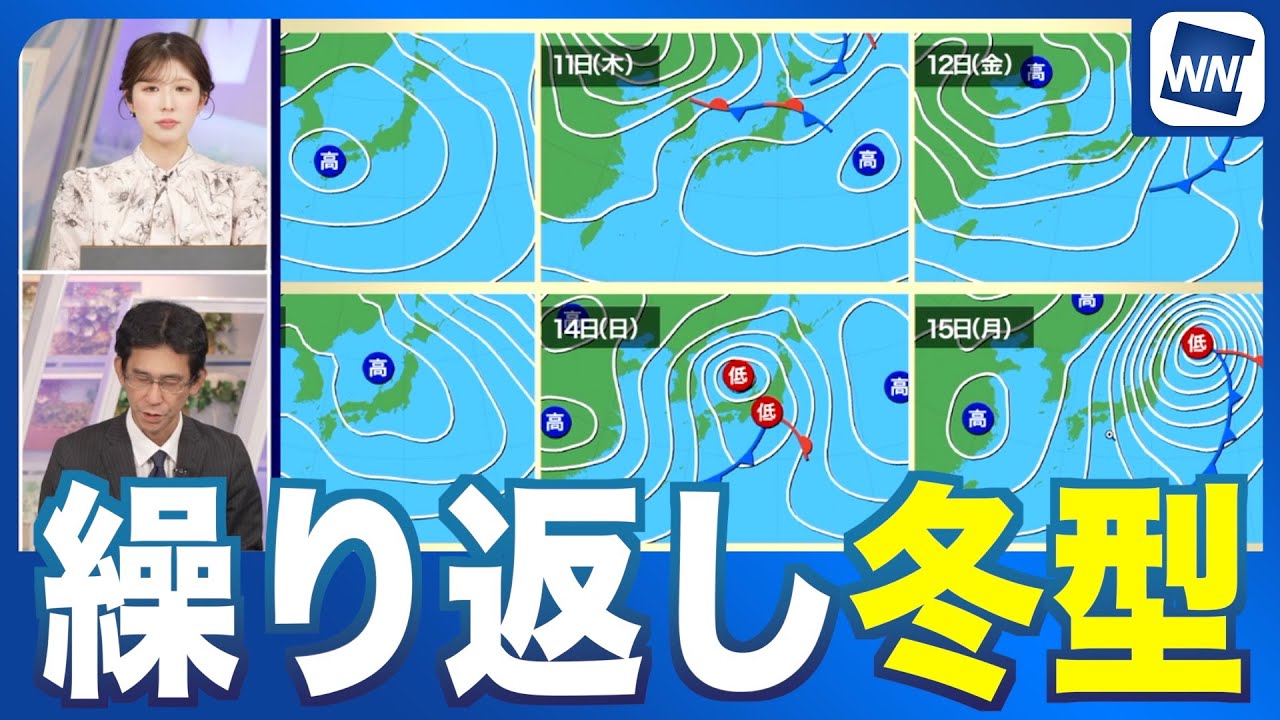 この先1 週間で天気を見ても旅々冬型の気圧配置となる日がありそうなんですね。 そうなんですよ。ま、目先12日頃と14 から15 日頃ここで、え、冬型がかなり強まる見込みなです。 で、天気でご覧いただきましょう。そのタイミング、その金曜日まず見てみますと、 またこれ日本付近安線の感覚狭いですね。この日は特に北日本中心にかなり強い関係が入ってきます。 そして14日曜日から15月曜日にかけて は日本レトあ気圧が急速に発達をしながら 通過をしまして、ま、15日は12日以上 に到圧の感覚が狭く表現されております 通り、非常に強い冬配置となります。で、 換期の強さとしては、ま、例えば12in の、え、上空1500m付近の温度の予想 なんですけども、ま、少しちょっと見にく 、え、見にくくなっておりますが、北海道 はですね、この辺りにありますね。この 辺りで北海道上空に流れ込む換気、この 1500m上空で18°線というものが 入ってきます。この辺り。からも真冬に 入ってくるぐらい強い換気が北海道北部 中心に覆いますし、平地の雨を行きに 変える目安-6°線は山から北陸付近まで 難をしてきて、やはり雪の古エリア、ま、 中付金でも広がるということが予想され ます。え、この12日は強い冬型による 大行き吹雪ですね。あとは低音。この辺り がポイントです。14から15は天域圧が 猛烈に発達をしますので、ま、防風説です ね。え、それによる災害の発生に要計と なります。え、まとめて見てみますと こちらですね。ま、12日頃は札幌と金沢 雪アイコンです。北陸西部でも雪の可能性 。山沿内陸部は北陸は広く大行きの恐れが あります。で、14 日はまず全国的に低気圧の影響で崩れて、ま、 15 が冬型なんですけども、太表側は回復していけます。 はい。 ただし日本海側は雨で地体は 12日より15 日の方が弱いんですけども、秋の通り風は 15 日の方がかなり強く吹きそうですからね。え、全国的な荒れた天気となりそうです。 はい。換気の影響などもあり、この先度旅 度々気温が低下したり、また雪が強く降っ たり、風も強まるタイミングがやってき そうです。今後も是非最新の情報にご注意 ください。詳しくはお天気アプリウェザー ニュースから是非ご覧ください。