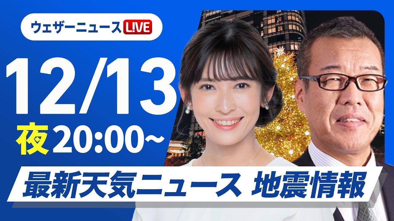 【ライブ】最新天気ニュース・地震情報 2025年12月13日(土) /東海、関東は明日午前中が雨のピーク〈ウェザーニュースLiVEムーン・山岸愛梨/森田清輝〉