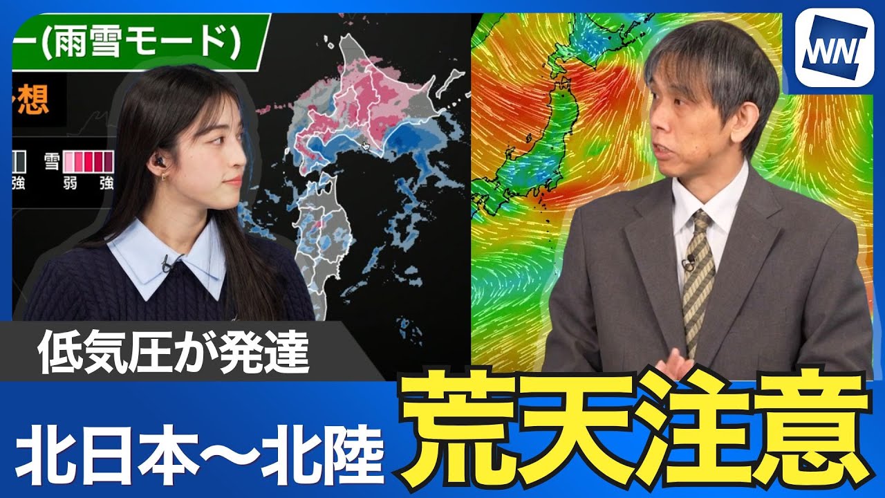 北日本の日本海側を中心に雨となります。雷や荒られを伴って強まる可能性があります。ま、吉野さん、現在の様子はどうでしょうか? はい。現在はまだ雨行きのところそれほど多くないんですけれども、この後は低気圧前線の通過によりまして、え、だんだと天気が崩れる状況となります。 え、現在の状況から見ていきますと、この 時間雨雲雪雲の大波はまだ会場にあります けれども、一部元半島ですとか、東北の 日本海側にかかり始めて雨の報告が届き 始めてる状況です。え、この後は低気圧 前線が徐々に通過していくということで、 え、こういった雨や雪の範囲が広がって いく三通です。低気圧の北側には換期が ありますので、え、低気圧の北側にあたり ます。北海道は雪が死体ですけれども、 南側の東北や北陸は日中は雨で経過すると 見ております。特にこの関冷前線の周辺で は待機の状態非常に不安定になりますので 、落雷などの心配もある状況です。雨雲の 予想を見ていきますと、ちょうどこの関冷 前線の通過、東北ではお昼前、北陸でもお 昼過ぎにかけてということになります。え 、黄色表示が出ているように発達した雲が 通過しますので、こういったタイミングで は雨が一時的にざーっと強まったり、雷 ですとかトップ荒られなどを伴う心配が ありますので要注意ということになります 。え、そしてこの低気圧の北側の北海道、 こちらは雨ではなくて雪というところが 多くなります。このピンク色の表示の ところは雪を示しておりますけれども、お 昼の時点で北海道の内陸部は大部分が雪で 、え、特にこの時間帯は同を中心に雪の 強まるところが多くなる三通です。そして 午後にかけて低気圧が北海道の太平洋沿岸 を進んでいきますので同等でも徐々に雪の 範囲が拡大していきます。え、特にこの 同等の内陸部では、あ、夕方にかけて1 時間に3cmから5cm程度の強い振り方 になる心配というのもありますので、路面 状況の急速悪化が心配される状況です。え 、今夜までに予想される積の分布見ていき ましても、え、特に山沿いのエリアでは 10cm以上、え、同等でも内陸部を中心 に5cmから10cmと雪のツもるところ が多くなる見通しです。 え、今日は比較的気温が高めで閉めてった重たいということになります。え、路面が非常に滑りやすくなりますので要注意ということになります。さらに低気圧や前線の通過に伴って風も強く、え、に北陸を中心に一部で平均 10 以上の風というところが出てきております。 はい。 変わりましては時的に冬型の気圧配置となりますので、え、北陸や北日本を中心に西の風が強く吹く見通しです。雨や雪に加えまして、え、風も強まるということになります。横殴り吹雪といった状況も予想されますので、大きめの傘などを用しておくことが重要かと思われます。 はい、わかりました。 ね、皆さんも引き続き外出する際甘く忘れ ずにお持ちください。今後の最新の気象 情報はウェザーニュースのアプリでもご 確認いただけます。