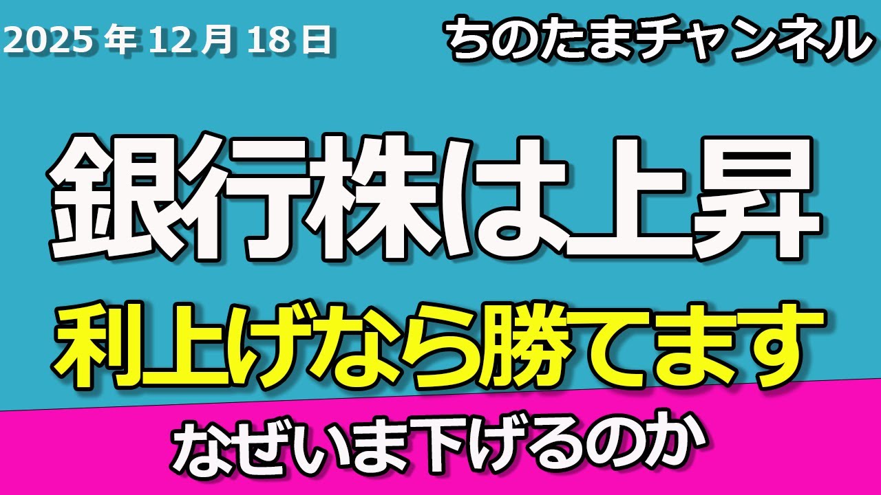 ちのとです。一歩のます。コナお願いし ます。銀行株いよいよ日銀の金融政策決定 解 ですけれどもまあ事前にね今回はもう 折り込みが非常に進んでしまいましたと いうことで、ま、もしかしたらね、これ 事前に材料が出尽くしているというような 見方もできるぐらい、え、今下落方向に 入ってます。ま、もちろん全体試合の弱さ 、え、というのもね、1つ、え、大きな キックではあるんですけれども、ただ やはり、基本的にはね、こう利上げという ところは長期金利の上昇もそうですけれど も、銀行株にとってはプラスということに なりますんで、ま、これね、え、少し、え 、短い時間軸ですけども、25MAタッチ という意味で、ま、会場は来ているという 見方もできます。で、ま、もうちょっと 見るとね、え、もうすぐ下に75MA赤い ラインが、え、迫ってきていますんで、ま 、こういったところも会話になるんじゃ ないかな。そして決定介護当日。これね、 ま、これだけもう折り込み下落という形で 下に下がっていますんで、ま、そこまでね 、え、むちゃくちゃ下落して反応すること もないかなとも思っていたりしますんで、 ま、私自身はね、え、しっかりと握り込み ますし、ま、万が一ね、え、下落して来週 以降も、え、ね、え、下方向に入っていく ということになれば、ま、買い増し ポジションをね、しっかりと、え、気づい ていくだけかなと思っています。という ことで今日もね、ヘッドラインが色々出て きてますけれども、政策金利いよいよ 0.75% ということで、まあ30年ぐらいですかね 、え、とんでもない時間軸かかりました けれども、日本もね、ここまで来ていると いうことです。で、ま、この報道ね、え、 焦りですっていう風に書いてますけども、 焦ってあげているという感じはね、私はし ないとに思ってますね。あの、日銀として はね、え、ま、データ、そして、ま、物価 上昇、それから賃金、こういったところに 基づいて、あの、シクシとやってきている だけなので、今ね、焦って、え、0.75 にね、急いであけた、え、やばい、やばい みたいな感じには、ま、聞こえてこないと いう意味でも、ま、こういったとこね、 ヘッドラインとしては、え、まあね、騒が せているというかね、え、注目を集めて いるだけのようにも聞こえる部分はあるの かなと。で、え、ま、三井住友です。 こちらがね、意外と強いですね。えー、ま 、赤色三菱UFJがまあね、え、ちょっと 出遅れてる限り、え、出遅れているんです けれども、え、この間ね、三井住とも緑色 が上がってきているということになってい ます。ま、株やっぱりね、決算ですよ。 うん。決算がやっぱり秋にね、非常に 良かったという意味でもその決算材料って いうのをまだまだね、しっかりと抱えて いる状況ですし、ま、今ね、日銀のこの 決定介護においてもやっぱり高い値をね、 しっかりとキープできているというのは、 え、ま、これはね、え、の決算で、え、 数字が良かったというとこに終練してくる んじゃないかなと思ってます。ま、 やっぱり決算が、ま、これだけね、株価 上昇をね、え、ま、しかも長い時間軸で、 え、戦っていく中での、え、上昇にも つがるというところはね、今回しっかりと 把握をしておいた上で、やっぱりね、次 ですよ、次の決算っていうのがやっぱり出 てきます。それがね、え、来年のね、え、 ま、5月、え、あたりの決算ということ ですけども、そういったところもね、 しっかりとやっぱりね、ウォッチしていき ながら皆さんと一緒にね、利益を取れる ように準備をしていきたいと思ってます。 で、今日ね、え、ま、ザラバ中なんで ちょっと値動き激しいんで出してません けども、やっぱりSBI申請銀行について も5%でね、また吸心してますよ。という ことで日々ね、ま、上場ライターがね、 マ進という風になってますし、やっぱり これ銀行株自体はね、注目度高い銘柄に なってくると思いますんで、ま、利上げ 材料に関してはね、プラスという風に捉え ていきたいと思ってます。で、え、ま、 これ官房長官ですけれども、え、金融政策 、え、日銀に委ねられるべきということで 適切に運営してくれ。ま、今のね、運営 状況に関して、え、特に否定的なコメント も出てきていませんので、ま、政府公認の も、え、明日はね、利上げの発表という ことになるという風に思っています。え、 ま、記者会見ということですけれども、え 、具体的な判断については日銀がやって くれということと2%の、あ、物価安定 目標に向けて適切な金融政策を期待すると いうことですので、え、あ、ま、政府公認 のもいよいよ政策金利0.75%という ことのようです。ま、我々にとってはね、 ま、身近な生活では特に影響ないんです けれども、例えば住宅論抱えている方とか はね、え、ダメージがあると思っています し、ま、ただやっぱり物価に対してもね、 え、利上げしていかないとやっぱりね、 ハ止