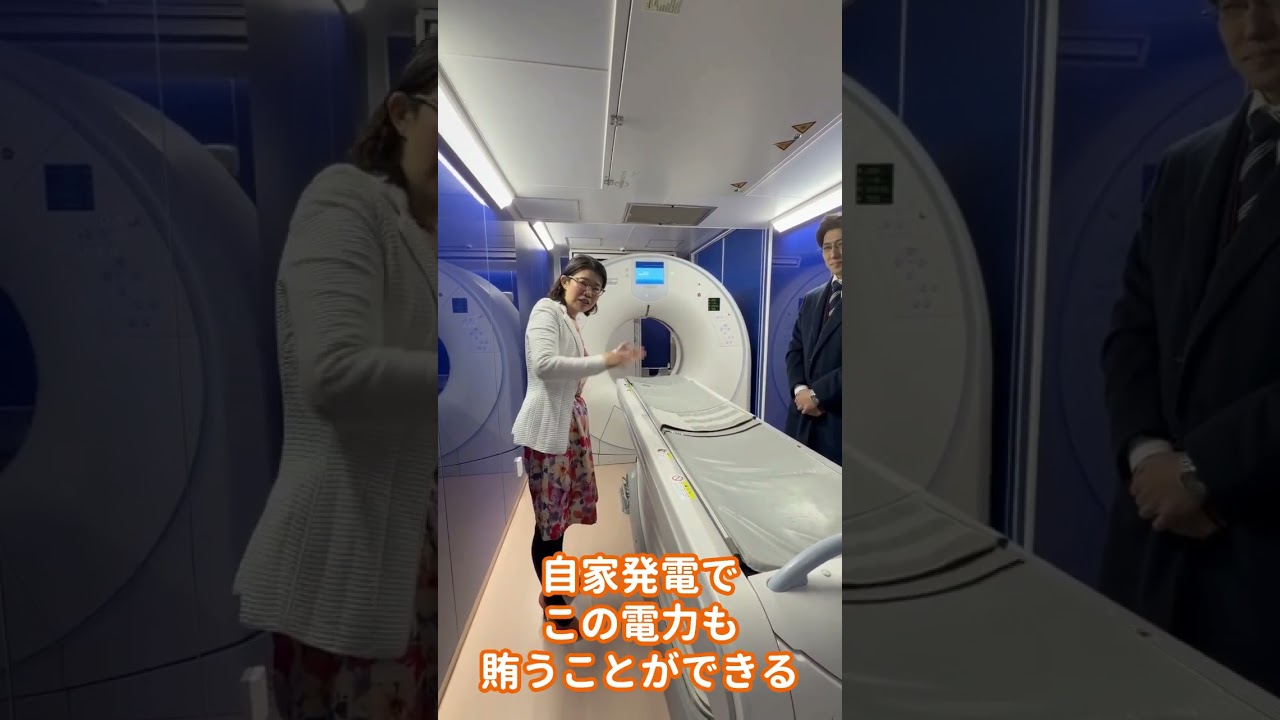 こんにちは。国水光彩綾野です。皆さんブラックとかありますね。よく見たらな CPの写真がついています。 今ここはですね、できるに載された医療コンテナなんですね。では早速中を見てみましょう。 はい、皆さん見てください。 CTです。モバイル型の医療コンテナに 搭載されているCTなんですよね。はい。 こちらは実は国内外はもちろんのこと、 海外でもすでに、え、日本からはい。協力 させていただいて、あの、いろんなところ に導入がされています。で、モバイルなの ではい。あの、いろんなところに 、そしてまた発電機が後ろにあるんですよ ね。はい。なので、あの、自価発電で、 あの、この電気や、あの、電力などもです ね、あの、賄うことができる本当に救え物 です。ですので、災害時もそうですし、 あるいは壁地などでもですね、はい。無損 やあの、おしゃれがないものたくさんあり ますので、そういうところでもご活躍 いただけるような素晴らしい旅行です。 是非日本のイノベーション世界しっかりと 外務省としても応援をしていきます。