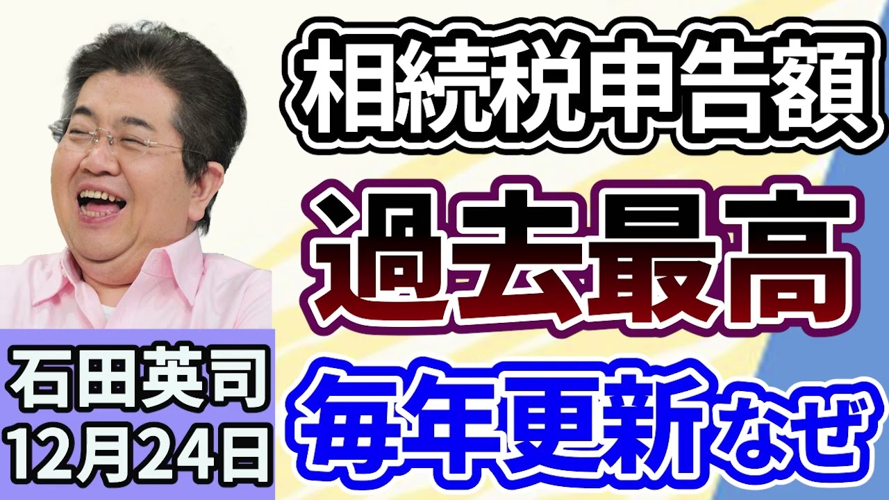 石田英司「相続税申告額、過去最高を更新、2021年分から毎年過去最高を更新している訳は?」「自民・国民民主、自動車購入時の『環境性能割』課税廃止で合意」「クリスマス予定なし、過去最高水準」12月24日