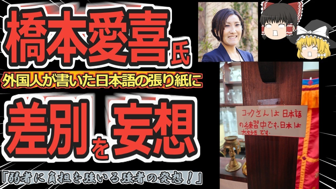 【ゆっくり動画解説】ツイフェミ橋本愛喜氏 外国人が書いた「日本は大好きです」と書いた張り紙の画像に勝手に差別を想像して辛いと書き込んで大炎上する