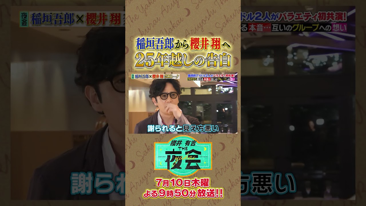 稲垣吾郎が櫻井翔に25年前から言いたかったこととは?🤔😳 \先行公開✨/ バラエティ初共演の禁断2ショットトーク🔑 SMAPと嵐の今だから明かされる本音トーク💘 今明かされる真実とは!?😳😳😳 このあと21時50分から放送です📺 お楽しみに🎶 #THE夜会 #稲垣吾郎 #櫻井翔 celebrityTBSTHE夜会吹石一恵夜会ハウス有吉弘行櫻井翔