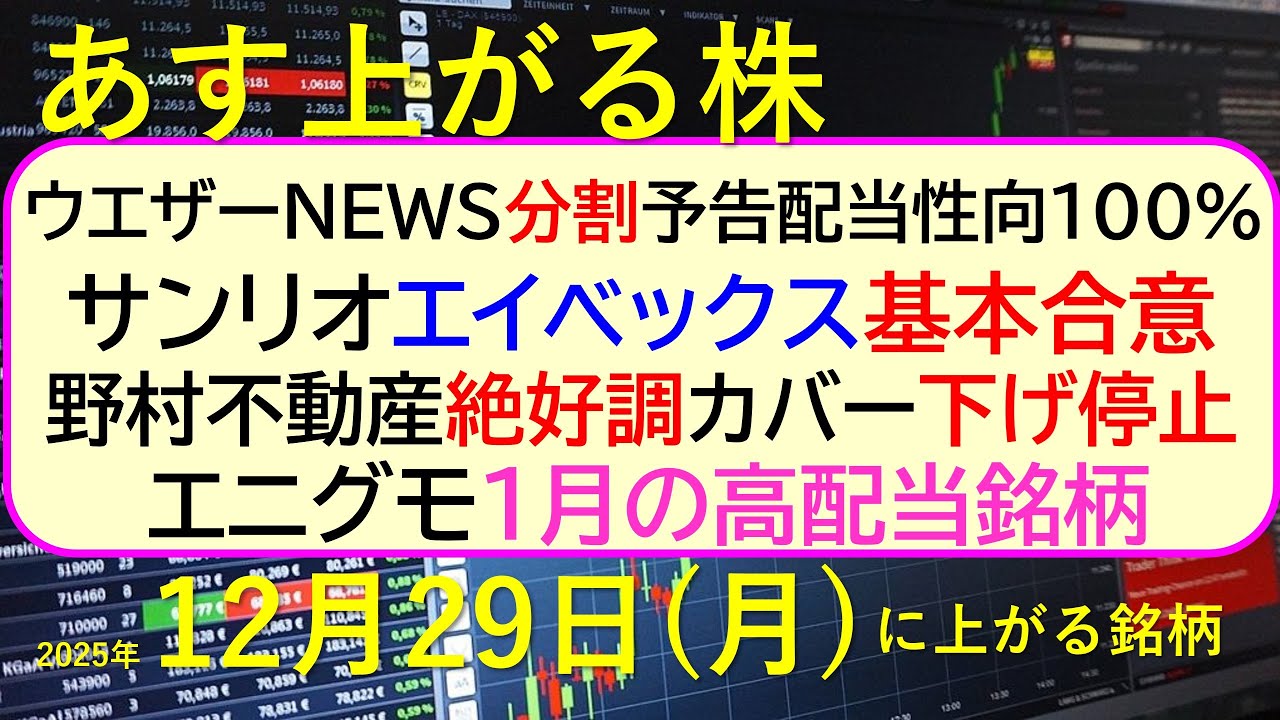 あす上がる株 2025年12月29日(月)に上がる銘柄。ウエザーNEWS分割配当性向100%。サンリオエイベックス基本合意。野村不動産好調カバー下停止~最新の日本株情報。高配当株の株価やデイトレ情報~