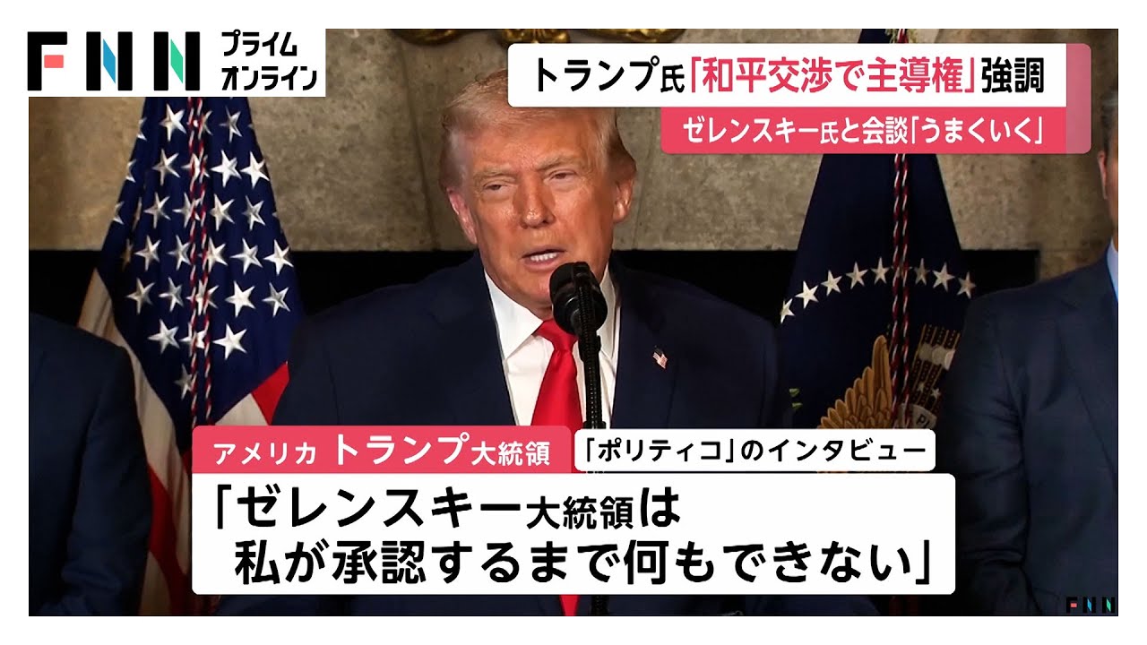 トランプ氏は26日のインタビューで、「ゼレンスキー大統領は私が承認するまで何もできない」と述べ、和平交渉で自らが主導的な立場にあるという認識を示しました。