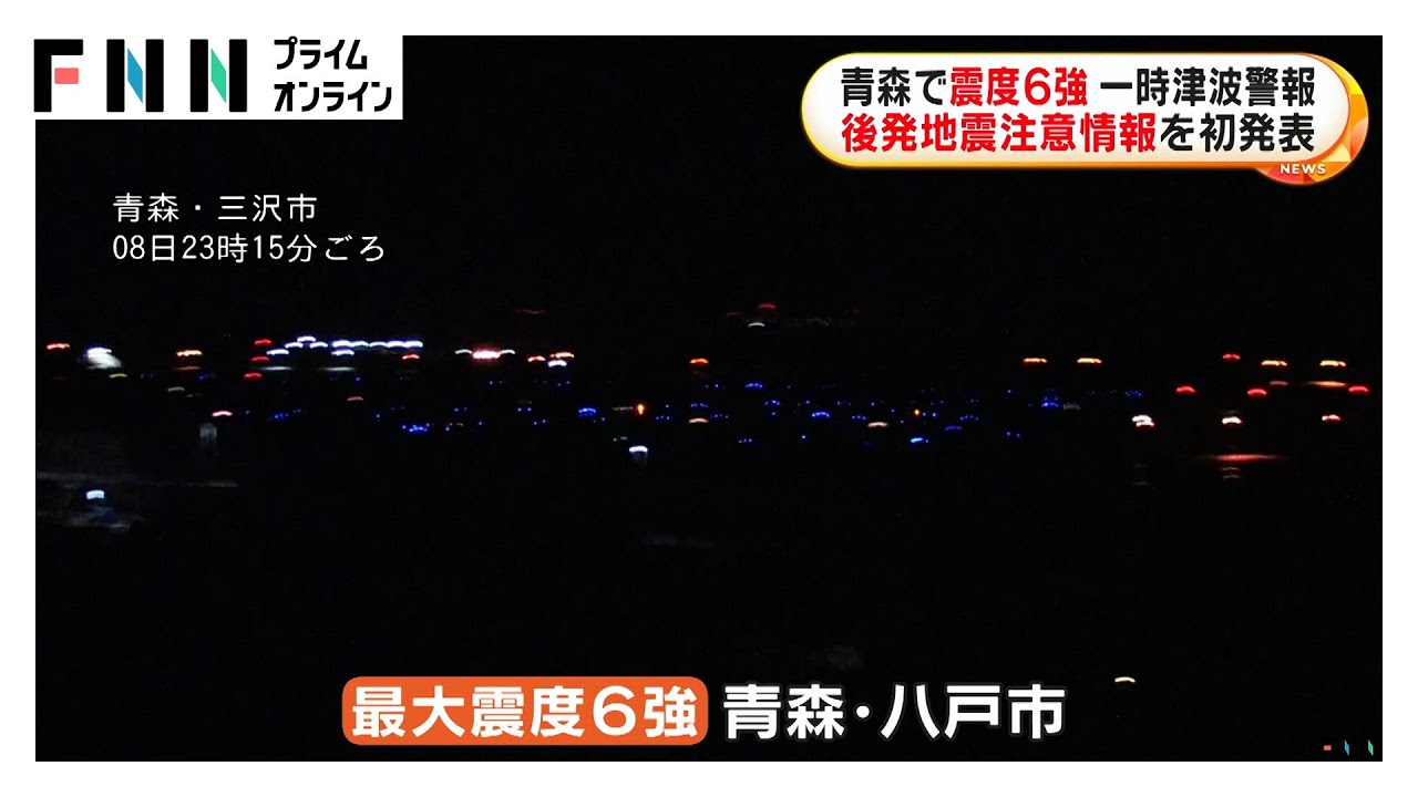 8日午後11時15分ごろ、青森県東方沖を震源とするマグニチュード7.5の地震が発生し、青森・八戸市で最大震度6強を観測しました。