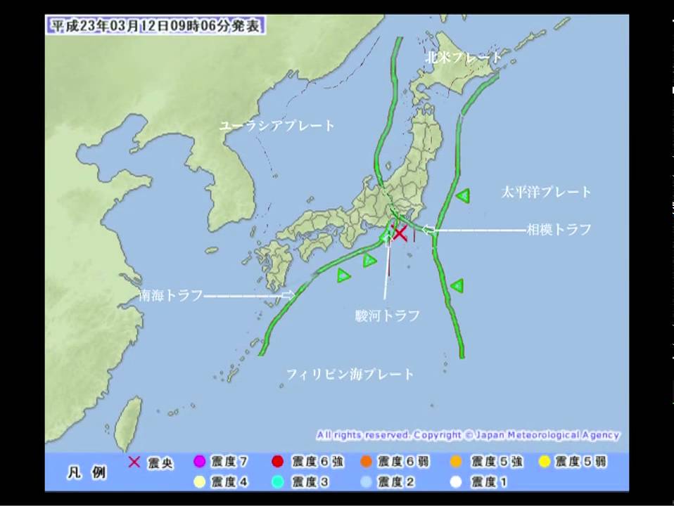 東北太平洋大地震の地震震源地情報及び震度情報を1秒単位で映像表示。