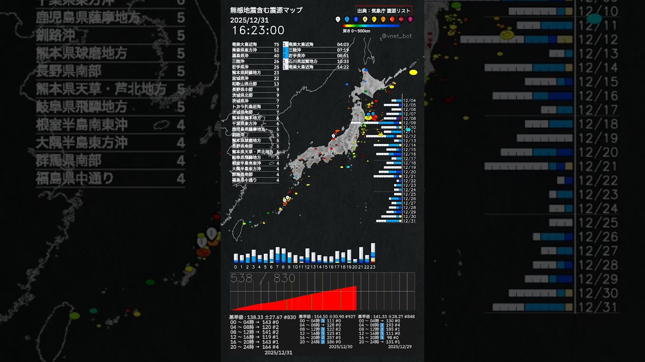 内容:2025年12月31日 作成:2026年01月01日出典:気象庁ホームページ 震源リストより 🔗 https://www.data.jma.go.jp/eqev/data/daily_map/20251231.html有感及び無感地震1日分の動画です本動画はYoutubeにも後ほどあがります。 🔗 https://youtube.com/@vnet_bot#地震 #jishin #earthquake EARTHQUAKEjishinNEWS地震震源情報