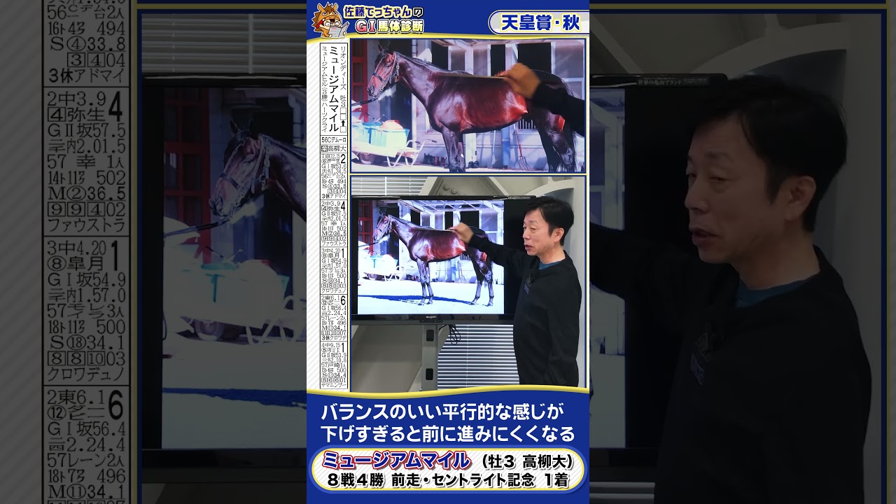 元JRA騎手・佐藤哲三氏の馬体診断はこの秋もショート動画としてお送りします。天皇賞・秋は計5頭の関西馬をピックアップしました。こちらは皐月賞馬ミュージアムマイルです。