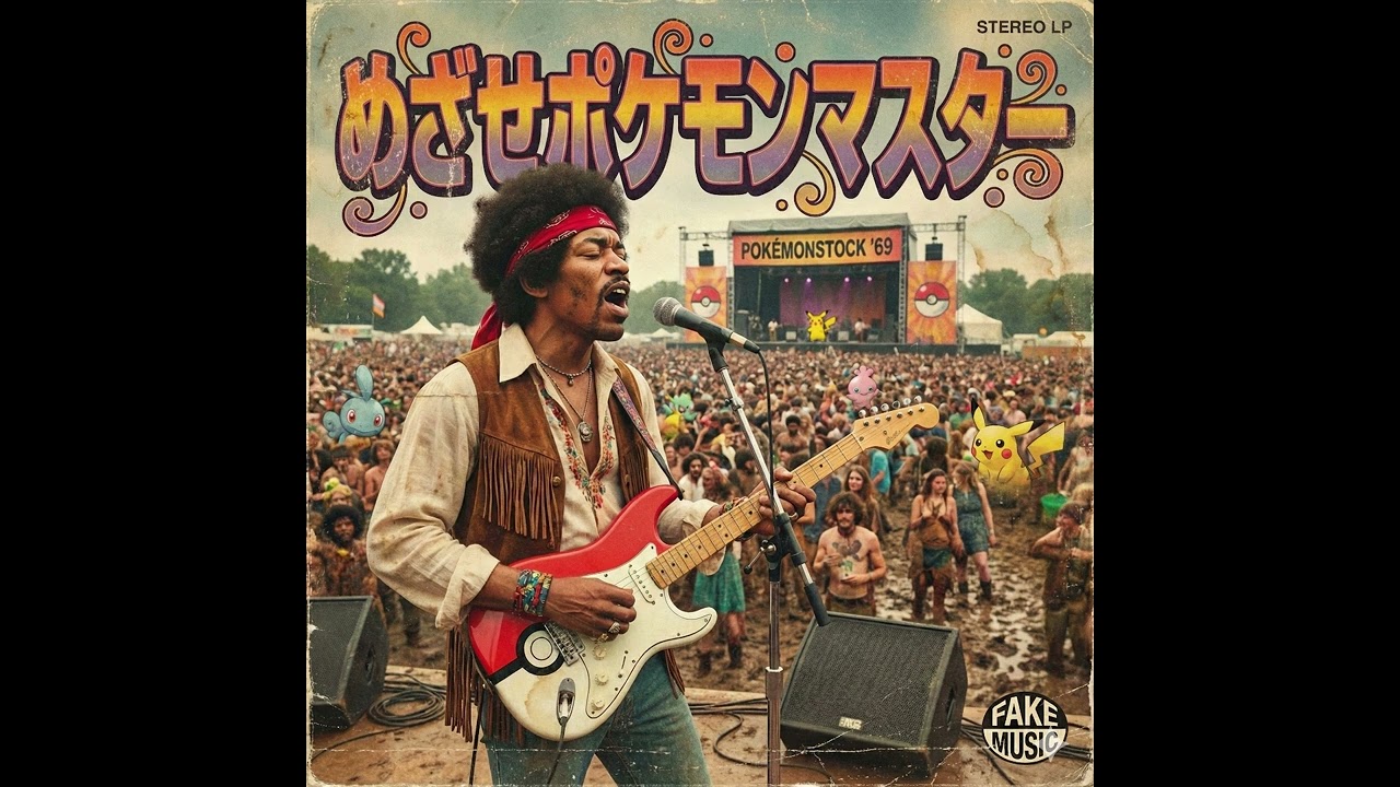 みんな知っている、あの希望に満ちた冒険の歌『目指せポケモンマスター』。 その魂を、1969年8月の「ウッドストック・フェスティバル」のステージへと召喚した。 そう、憑依させたのは、あの伝説のギタリスト、ジミ・ヘンドリックスだ!