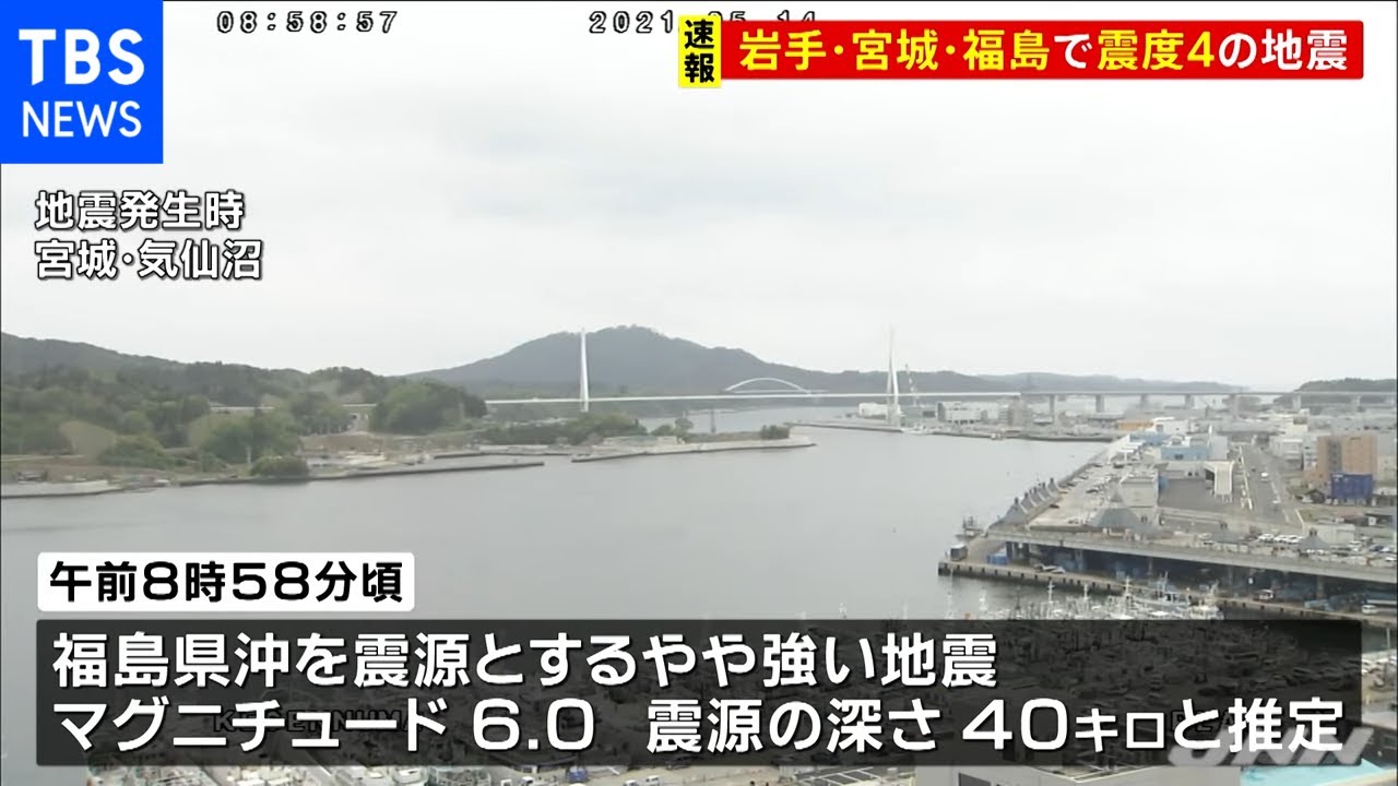 14日午前8時58分ごろ、福島県沖を震源とするやや強い地震がありました。地震の規模を示すマグニチュードは6.0、震源の深さは40キロと推定されています。