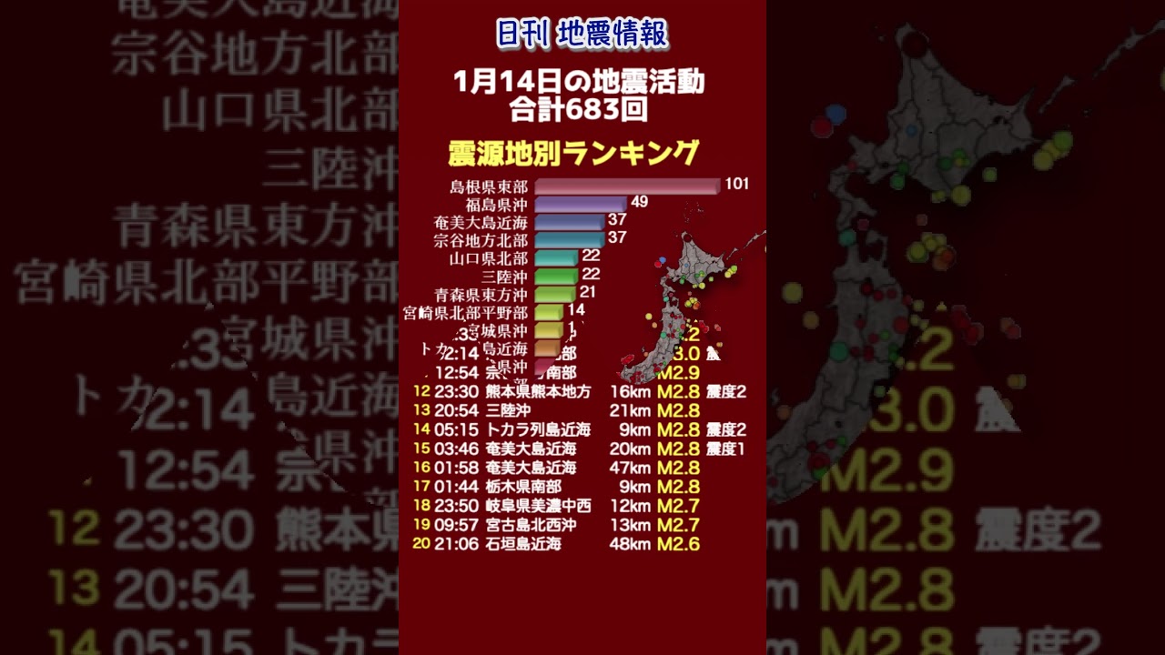 【地震情報】1月14日の地震活動2026年1月14日の地震活動です。気象庁より発表されます無感地震のデータを震源地ごとに集計しております。 #地震情報 #無感地震 #気象庁 1月14日NEWS南海トラフ地震情報気象庁無感地震震源情報