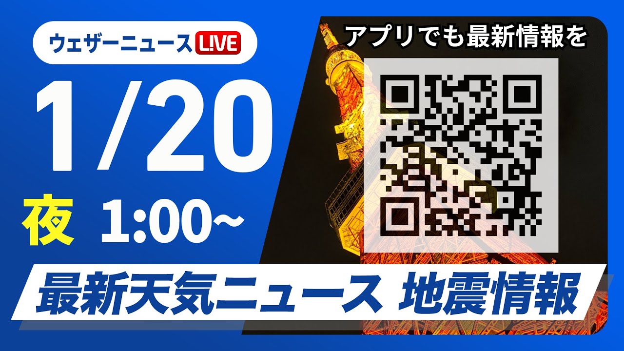 【ライブ】最新天気ニュース・地震情報 2026年1月20日(火) 1:00〜/週末にかけて寒波が襲来 道路の立ち往生などに厳重警戒を〈ウェザーニュースLiVE〉