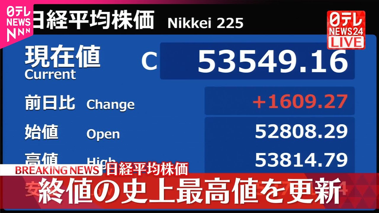 13日の東京株式市場で日経平均株価は先週末とくらべ1609円高い5万3549円で取引を終え、終値ベースで史上最高値を更新しました。