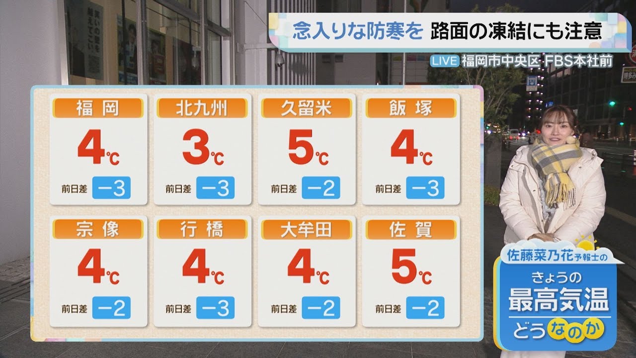 最高気温は福岡市で4℃、北九州市で3℃など、各地で4℃前後の予想です。この冬一番の寒さでしょう。日中も風が強めに吹き、数字よりも寒く感じられそうです。万全な寒さ対策をしてお出かけください。