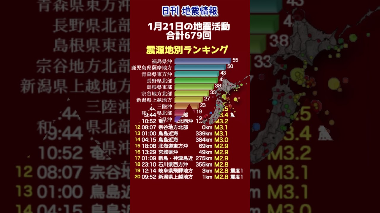 【地震情報】1月21日の地震活動 2026年1月21日の地震活動です。 気象庁より発表されます無感地震のデータを震源地ごとに集計しております。 #地震情報 #無感地震 #気象庁 1月21日NEWS南海トラフ地震情報気象庁無感地震震源情報