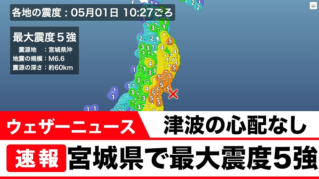 5月1日 10時27分頃、宮城県で最大震度5強を観測する地震がありました。震源地:宮城県沖 マグニチュード:6.6 震源の深さ:約60km この地震による津波の心配はありません。 2021Casterウェザーニュースキャスターゲリラ豪雨ゲリラ雷雨ニュース乾燥予報停電北日本台風台風情報地震地震情報大雨大雪天気天気予報天気痛情報暴風東日本気象気象予報士洗濯減災西日本防災