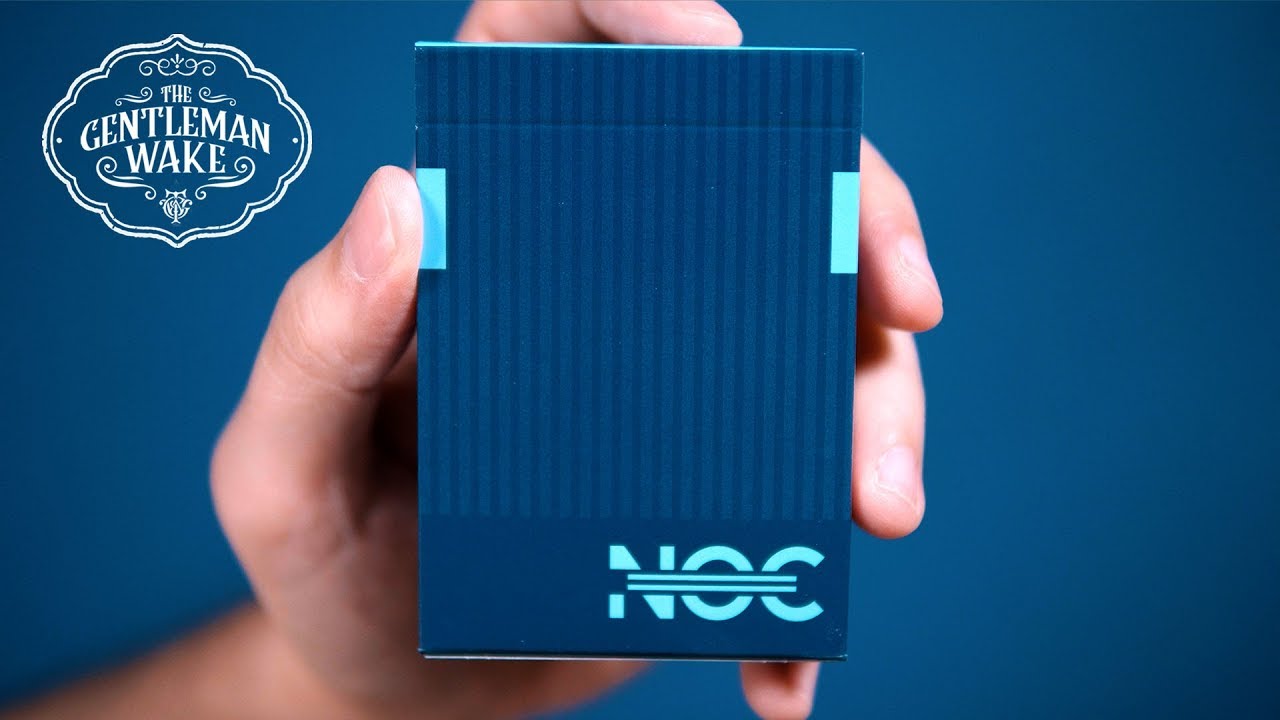 The NOC 3000X1 deck is the latest release from Magician, Youtuber and Entrepreneur Alex Pandrea. The decks were released as part of a social media event which included a short film by Pandrea’s friend and collaborator Nic Suriano which explains the fictional future dystopian origins of the deck. The film imagines the deck as an artifact sent back in time; the key to saving the future The decks come packaged in a standard glossy style USPCC tuck case and are available in two versions. The standard dark blue version and the limited edition white version–which was printed in an edition size of 3000. Both decks feature bright teal accents and a muted striped pattern ghosted in across the front. The back of the box features the deck name in a teal vertical graphic ribbon. The bottom features tiny ad copy and the top of the box is teal. Only the limited edition deck includes a seal–which is numbered out of the edition size of 3000.