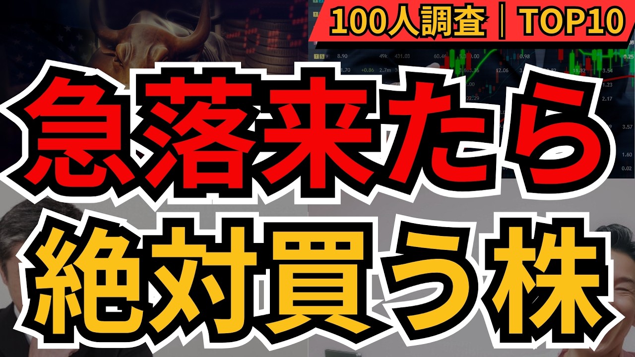 個人投資家100人に「次の暴落が来たら絶対買う株」を調査しBEST10を発表。1位トヨタ、2位三菱商事、3位JT、4位三菱UFJ、5位任天堂、6位NTT、7位武田薬品、8位伊藤忠、9位MS&AD、10位ファーストリテイリング。暴落時の買い方と優先順位、狙い目水準の考え方を短時間で整理します。