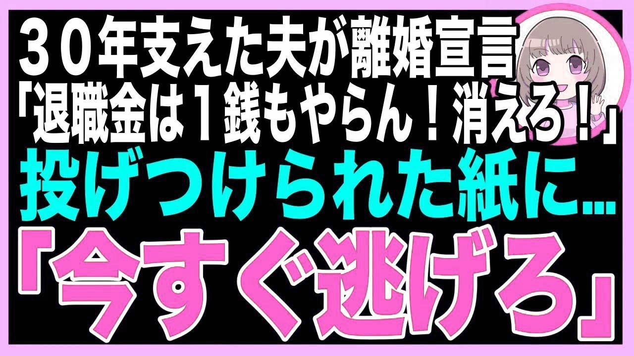 【スカッと】定年まで30年間支えた夫が離婚宣言「退職金は一銭もやらん!出てけw」→夫から投げつけられた封筒の中に「今すぐ逃げろ」のメッセージが→それを見た瞬間、家を飛び出し警察に駆け込んだ(