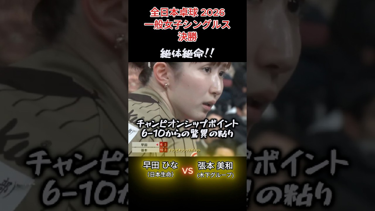 Share Facebook Twitter Pinterest LinkedIn 【全日本卓球2026】絶体絶命!!チャンピオンシップポイント6-10から驚異の粘り 張本美和(木下グループ)vs早田ひな(日本生命) 一般女子シングルス決勝 天皇杯・皇后杯 2026年全日本卓球選手権大会(一般の部) 女子シングルス決勝 張本美和(木下グループ)vs早田ひな(日本生命) celebritymiwa全日本全日本ジュニア全日本卓球初優勝張本美和早田ひな