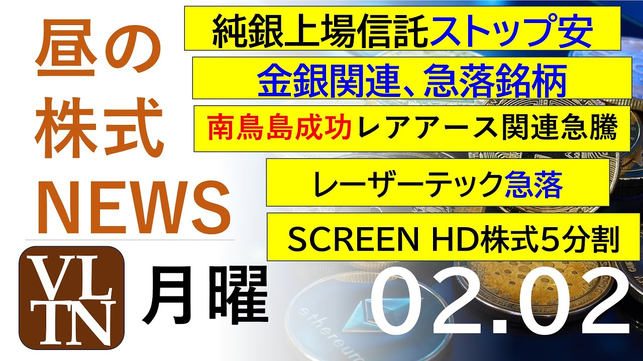 純銀上場信託ストップ安。レーザーテック-10%超急落。南鳥島成功レアアース関連急騰。金銀関連急落。決算速報。2026年2月2日(金)~明日上がる株最新の日本株情報。高配当株の株価やデイトレ情報~
