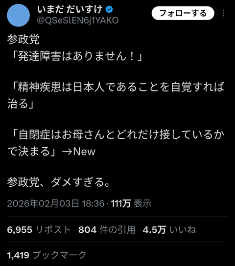 【参政党の先沖氏、自閉症巡り根拠欠く発言 専門家は批判「差別意識が根底」】 衆院選に神奈川14区から出馬している参政党新人の先沖仁志氏(49)が公示日の1月27日、相模原市緑区で行った第一声で「(子どもの)自閉症の原因はお母さんが長く接しているかが関わっているという研究結果がある」と述べ、自閉症の原因が母親の育て方にあると捉えられる発言をした。 原因は研究上、確立されておらず、専門家は「全く根拠がない。差別意識が根底に透けて見える」と批判。緑区では「津久井やまゆり園事件」が起きており、共生を目指す地域に差別を持ち込み、根拠のない情報を流したことにも非難の声が上がる。 https://www.kanaloco.jp/news/government/electiondata/article-1244833.html