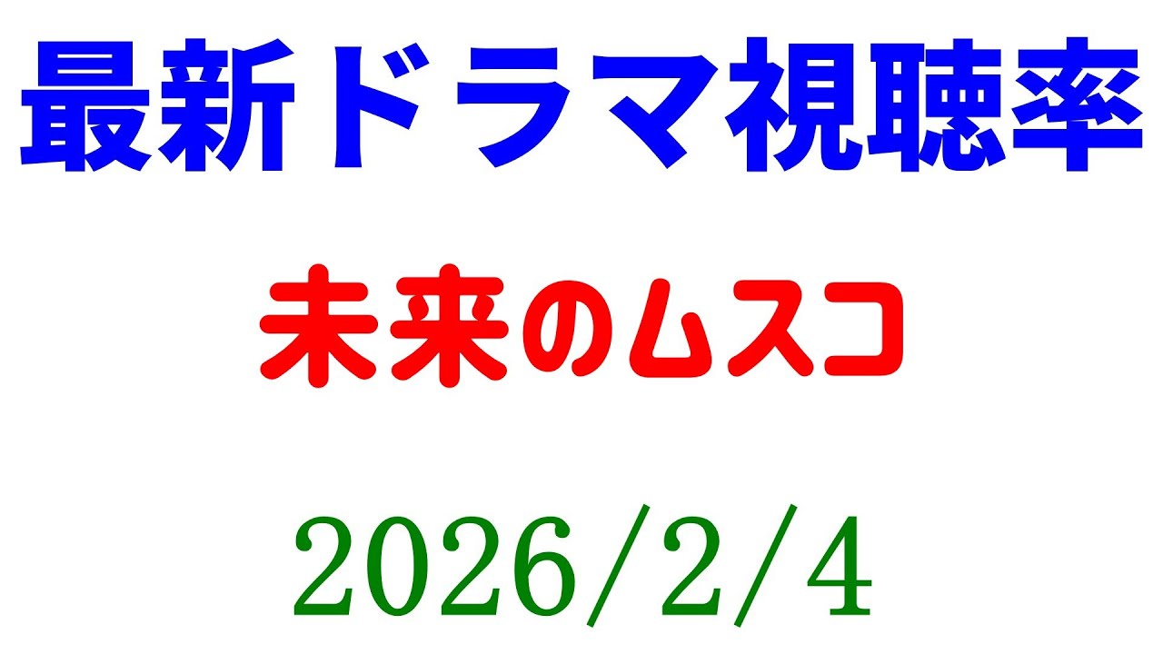 Share Facebook Twitter Pinterest LinkedIn 未来のムスコ 視聴率下がる!視聴率速報☆2026年2月4日 ### ☆Amazon欲しいものリスト https://www.amazon.jp/hz/wishlist/ls/3MTQPTNTTWFUH?ref_=wl_share <ツイッター> https://twitter.com/KkReview このチャンネルのメンバーになって特典にアクセスしてください: https://www.youtube.com/channel/UC8I3iWxXV7Zqa5PpAeAlcFA/join dramaTVドラマテレビドラマドラマドラマ視聴率レビュー感想考察視聴率