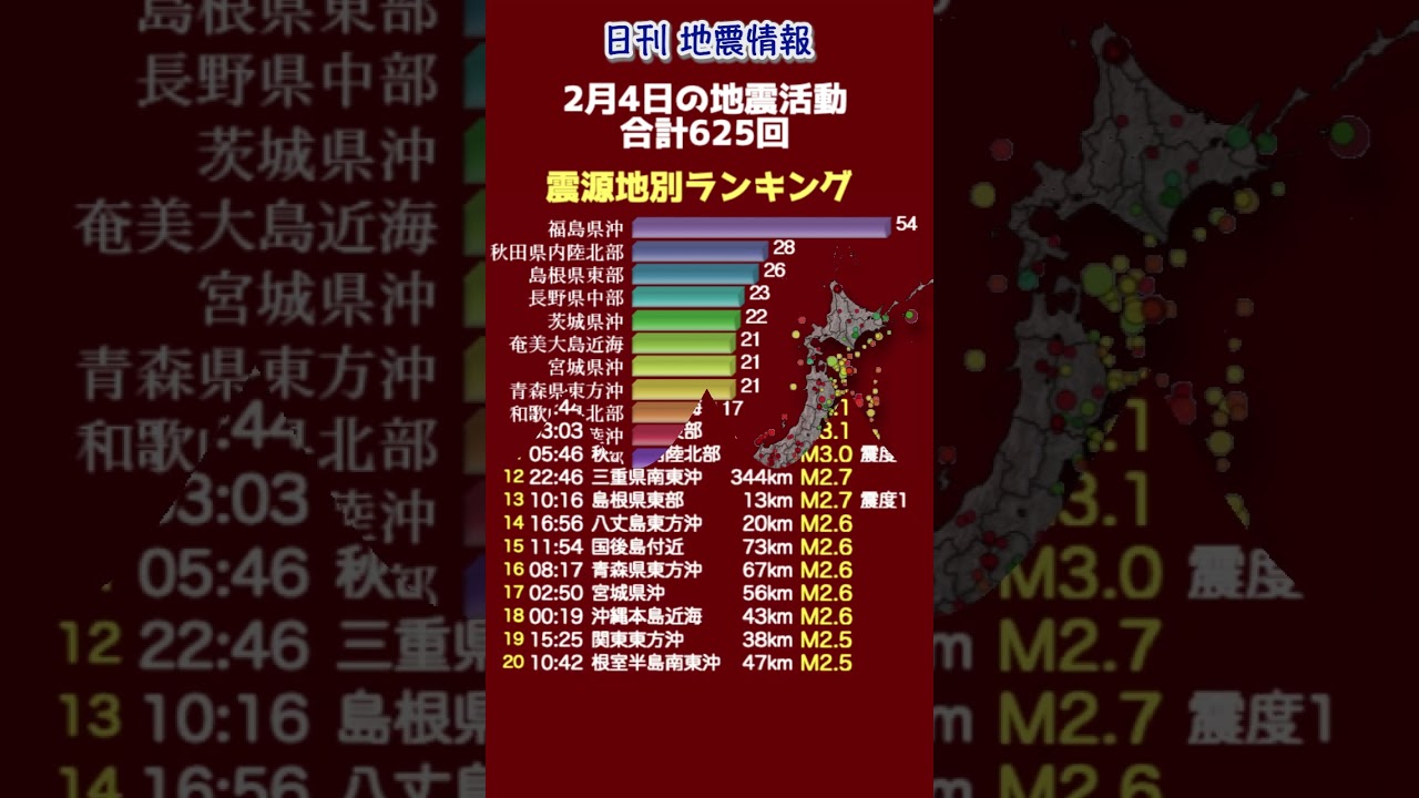 【地震情報】2月4日の地震活動 2026年2月4日の地震活動です。 気象庁より発表されます無感地震のデータを震源地ごとに集計しております。 #地震情報 #無感地震 #気象庁 2月4日NEWS地震情報気象庁無感地震震源情報