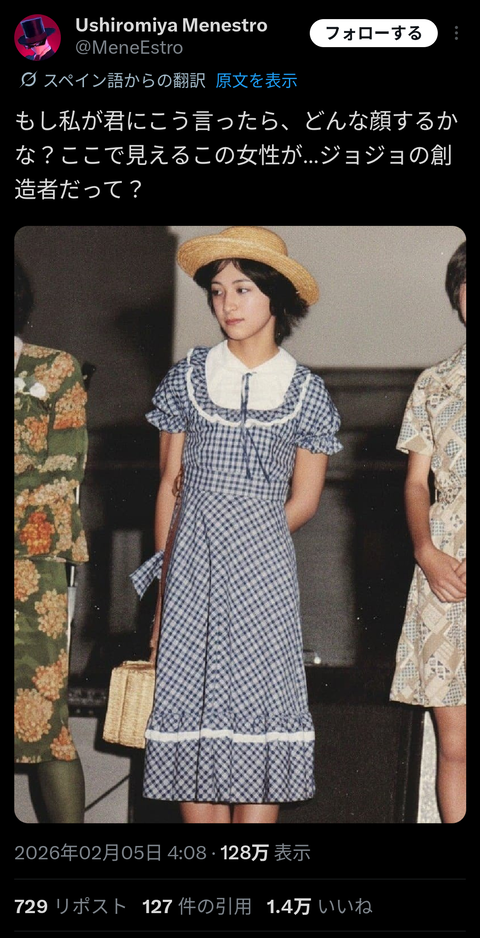 荒木飛呂彦先生の女装姿が流出、ファンは「美少女すぎ」や「ビビった」感想で沸騰(2026/02/05)| https://search.yahoo.co.jp/realtime/search/m…c942b3a4810-1770291900