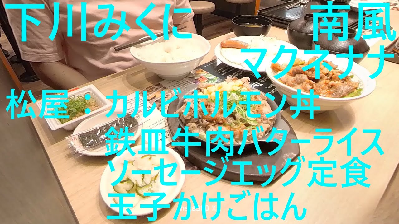 マクネナナに下川みくにの「南風」を歌わせました。動画は松屋門で、カルビホルモン丼ライス大盛、鉄皿牛肉バターライス大盛、ソーセージエッグW定食納豆ライス特盛、玉子かけごはん納豆特盛を食べたときのです。