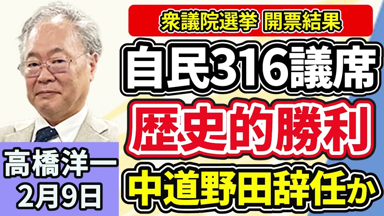 高橋洋一「衆議院選挙 開票速報 自民単独316議席で歴史的勝利、中道惨敗で野田共同代表『万死に値する責任』」「アメリカのトランプ大統領と中国の習近平国家主席が電話会談」2月9日
