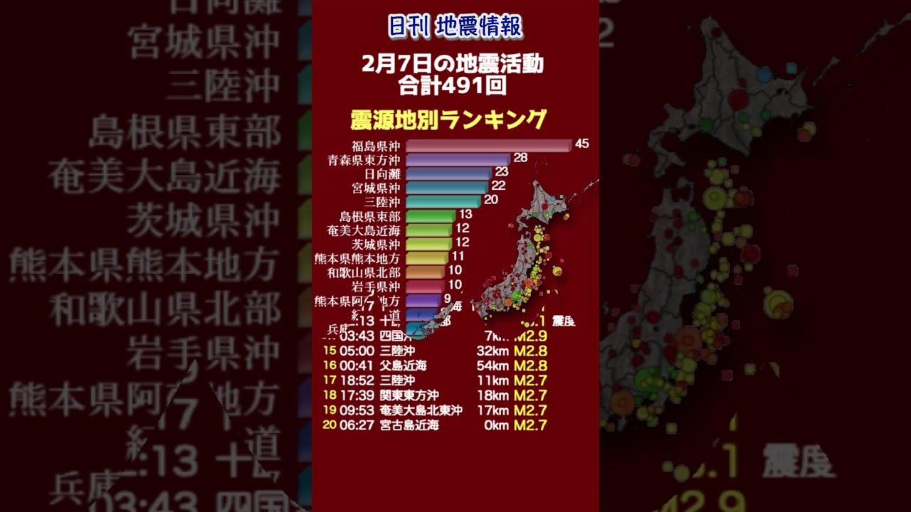 Share Facebook Twitter Pinterest LinkedIn 【地震情報】2月7日の地震活動 2026年2月7日の地震活動です。 気象庁より発表されます無感地震のデータを震源地ごとに集計しております。 #地震情報 #無感地震 #気象庁 2月7日NEWS地震情報気象庁無感地震震源情報