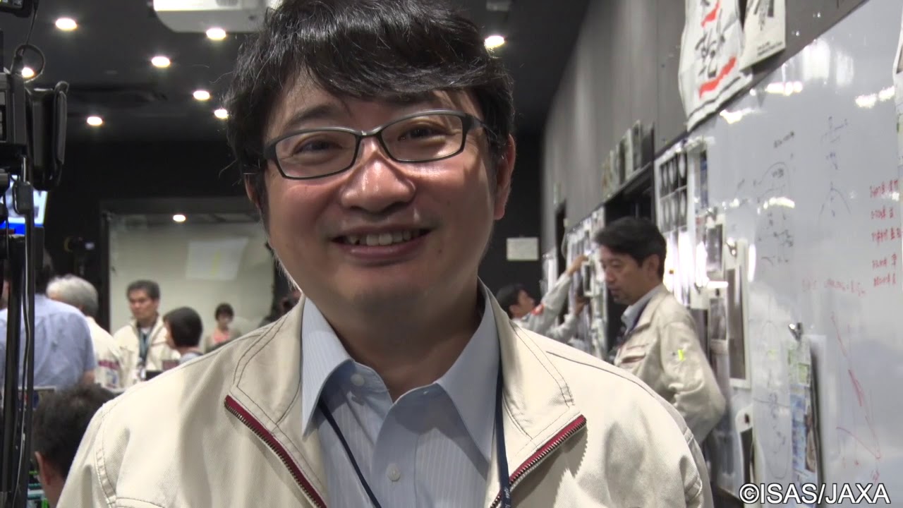 7月11日に宇宙航空研究開発機構(JAXA)が実施した、小惑星探査機「はやぶさ2」の小惑星リュウグウへの第2回タッチダウン運用において、タッチダウンの成功が宣言された直後に行われた佐伯孝尚プロジェクトエンジニアへのインタビューの様子 (提供:ISAS/JAXA) JAXAはやぶさ2リュウグウ劇場版 HAYABUSA2~REBORN宇宙