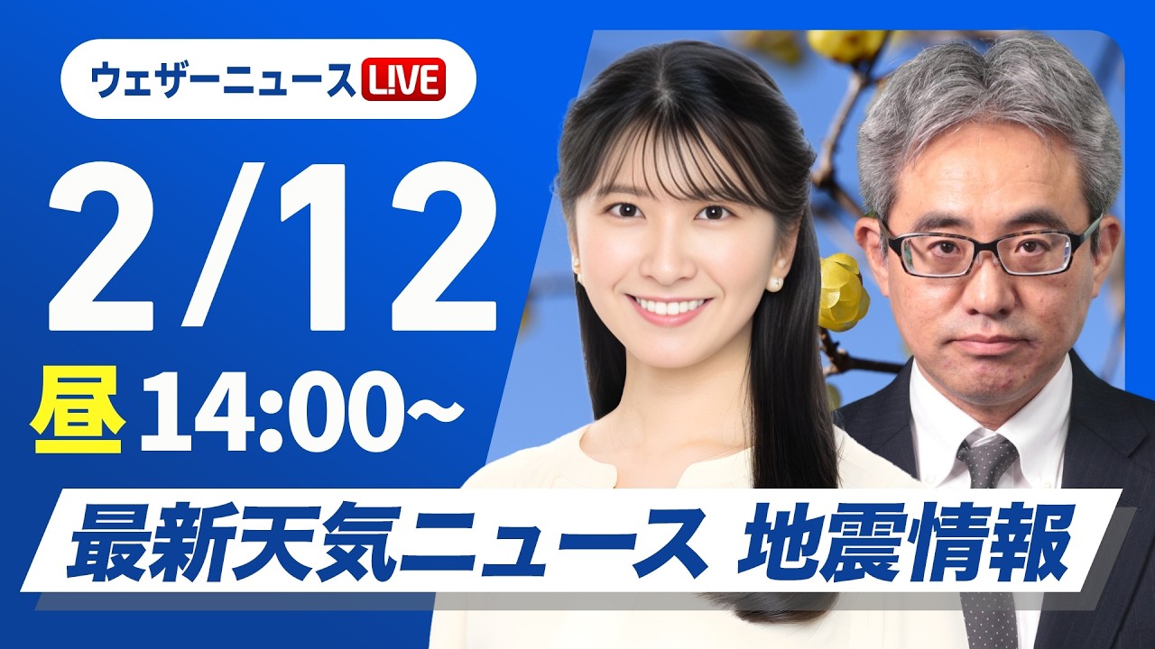 【ライブ】最新天気ニュース・地震情報 2026年2月12日(木) /北日本は雪の強まる所も〈ウェザーニュースLiVEアフタヌーン・駒木結衣/本田竜也〉
