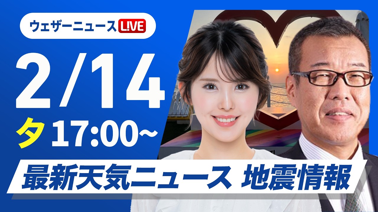 【ライブ】最新天気ニュース・地震情報 2026年2月14日(土) /バレンタインはお出かけ日和 明日はさらに気温上昇〈ウェザーニュースLiVEイブニング・小川千奈/森田清輝〉