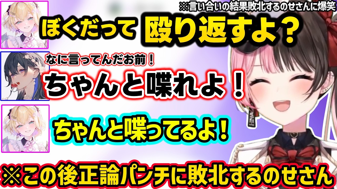 言い合いの結果のあのド正論パンチに敗北するのせさんに爆笑するひなーの、声が通りづらい事を悩むのあの練習用で始まった大声APEXで主張が強すぎるのせさんに爆笑するひなーのなど。