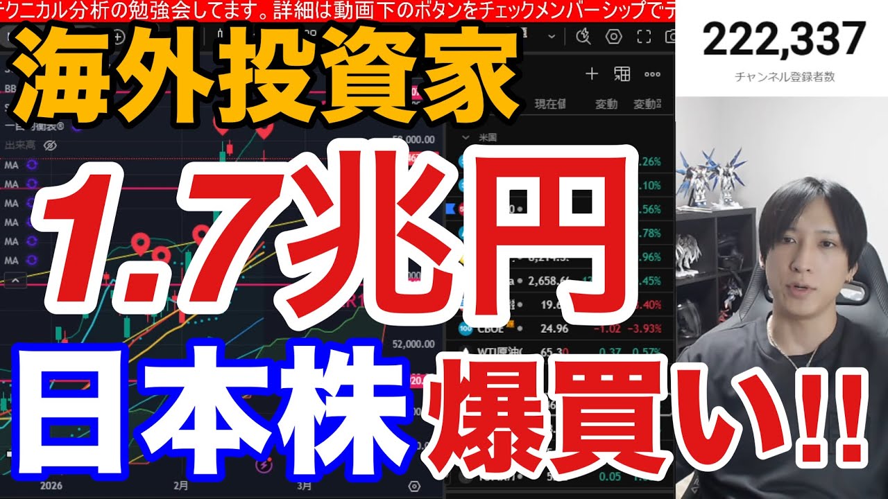 2/19【海外投資家が日本株を1兆7838億円爆買い‼】日経平均2年分折込で58,500円限界か⁉ドル円155円に急伸。SaaS関連暴落一服。米国株、ナスダック、半導体株は小幅高。仮想通貨BTC軟調。